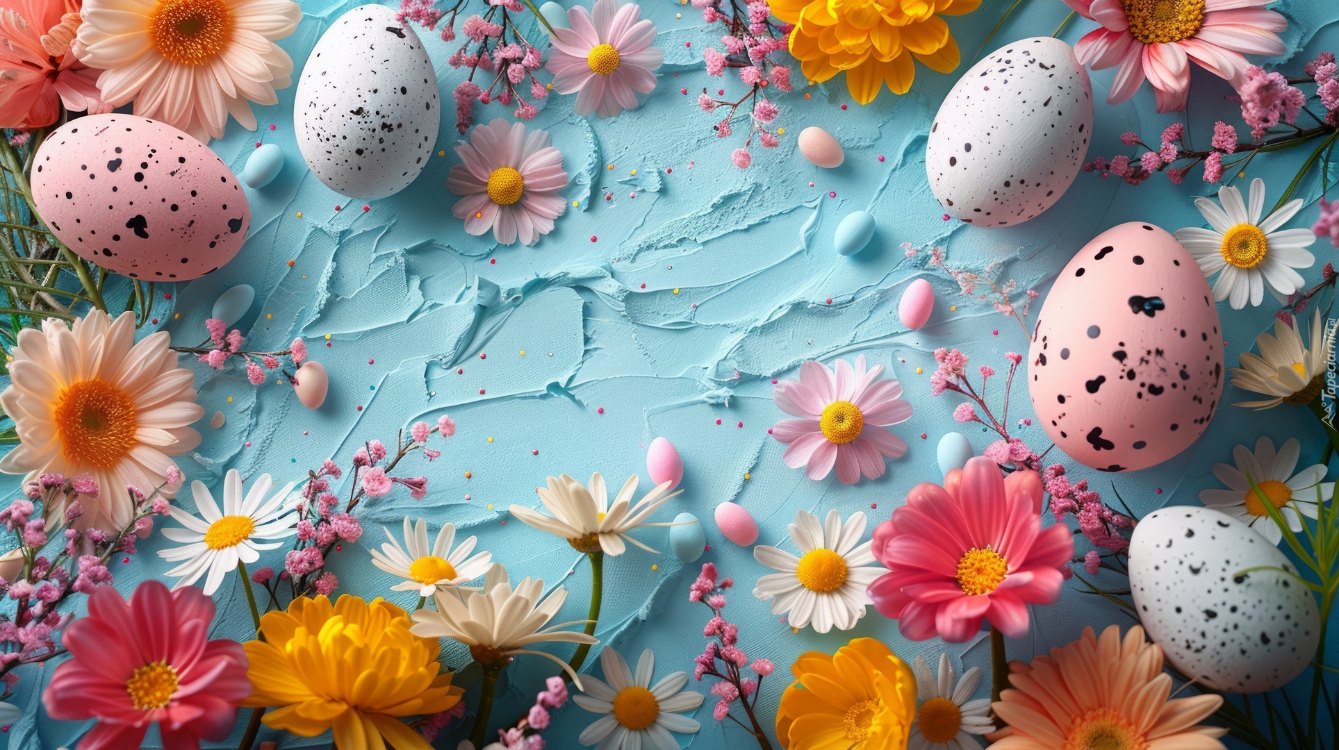 Edytor tapety: Kolorowe pisanki wśród kolorowych kwiatów na niebieskim tle