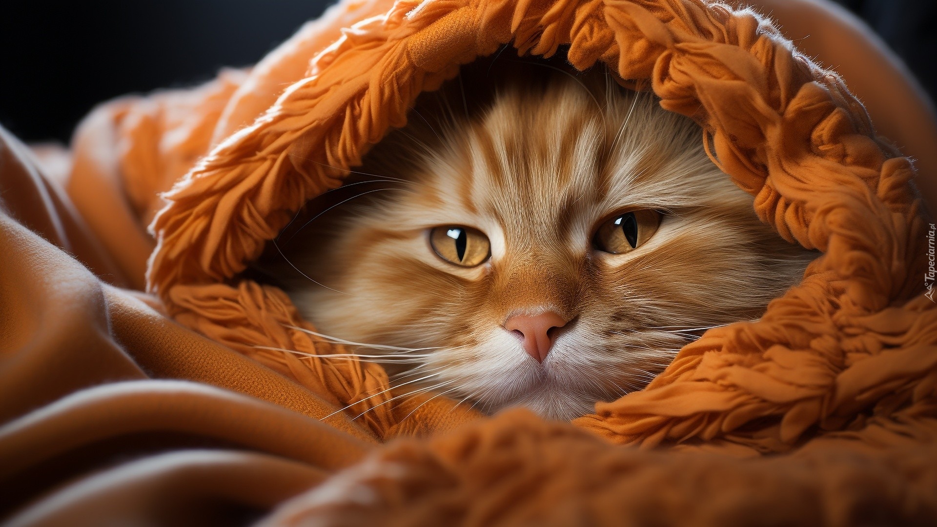 Edytor tapety: Pyszczek rudego kotka wystający spod pomarańczowego koca