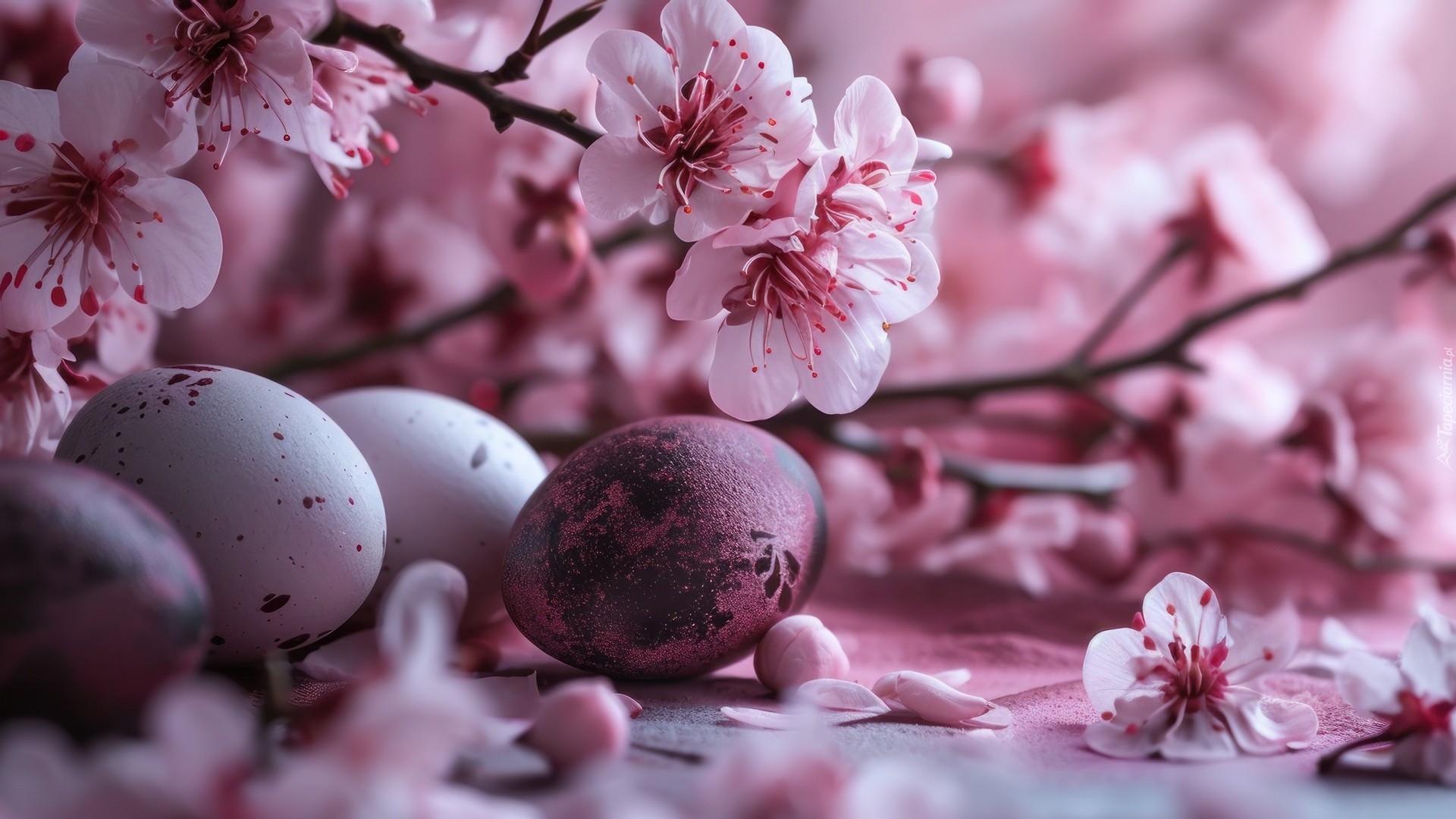 Edytor tapety: Bordowe pisanki wśród gałązek z czerwono-białymi kwiatami