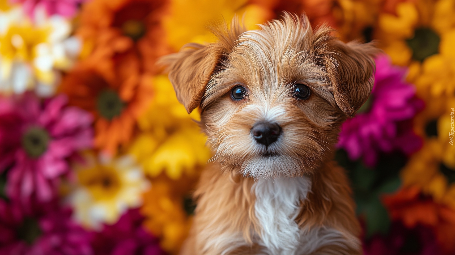 Edytor tapety: Rudo-biały pies na tle rozmytych kwiatów