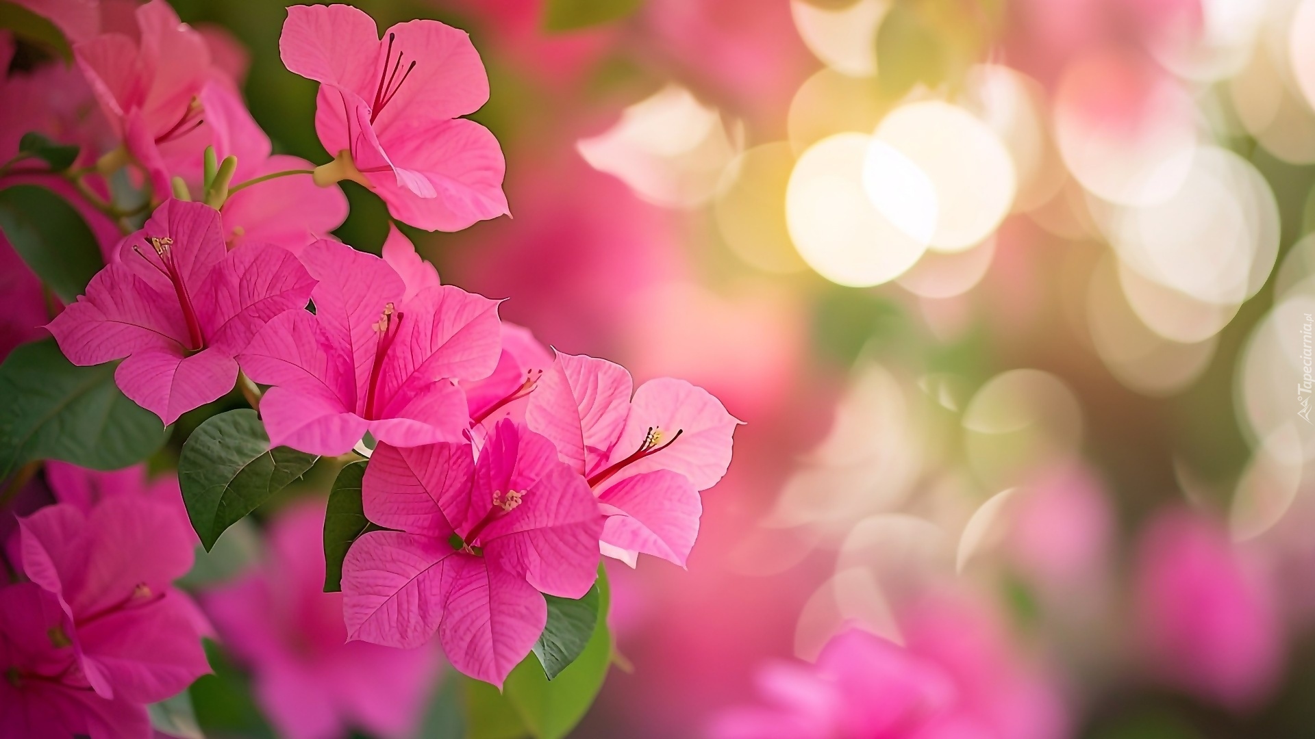 Edytor tapety: Różowe kwiatki i liście na rozświetlonym tle