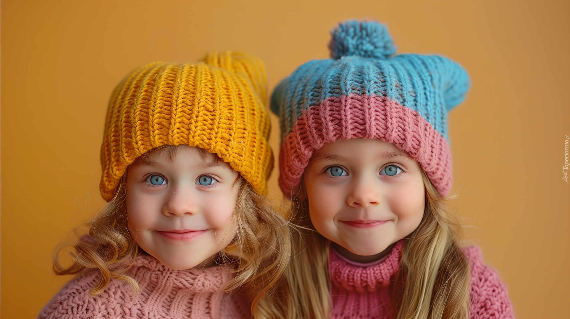 Edytor tapety: Uśmiechnięte dwie dziewczynki w wełnianych czapkach i swetrach