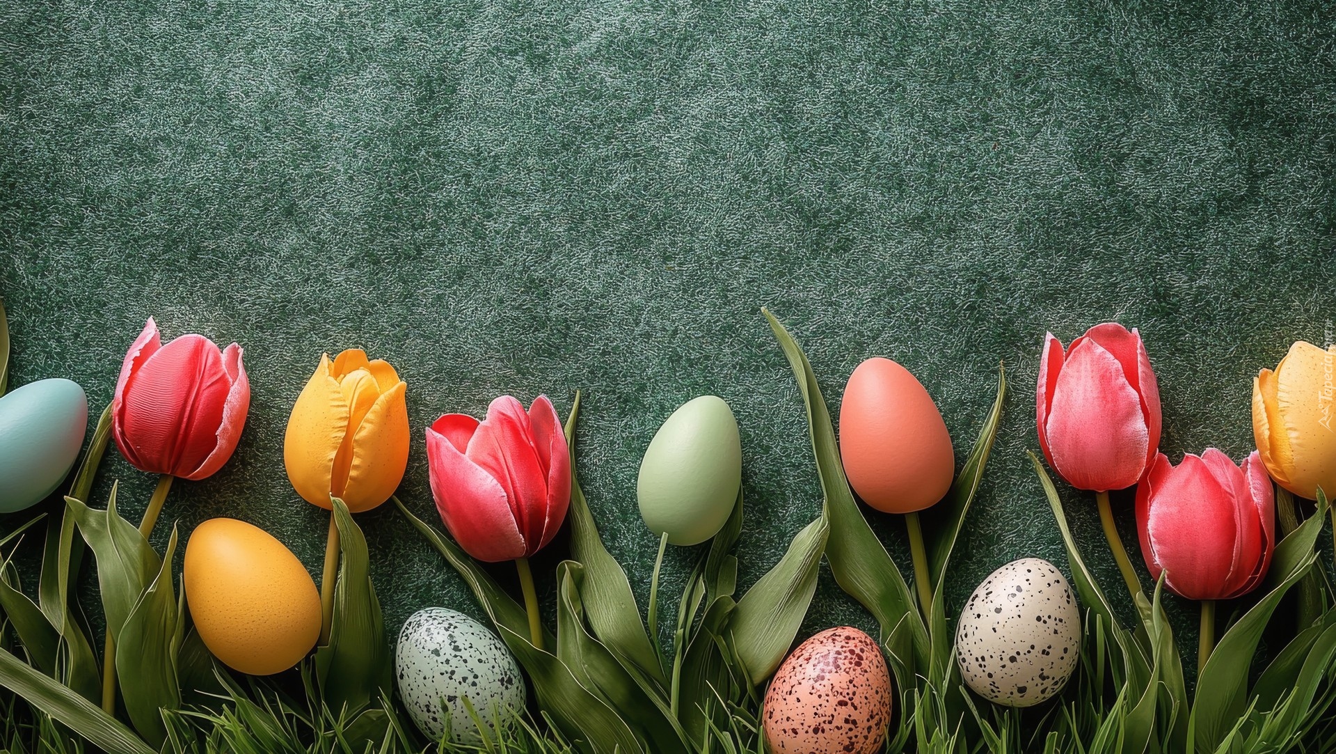 Edytor tapety: Nakrapiane pisanki i kolorowe tulipany na zielonym tle