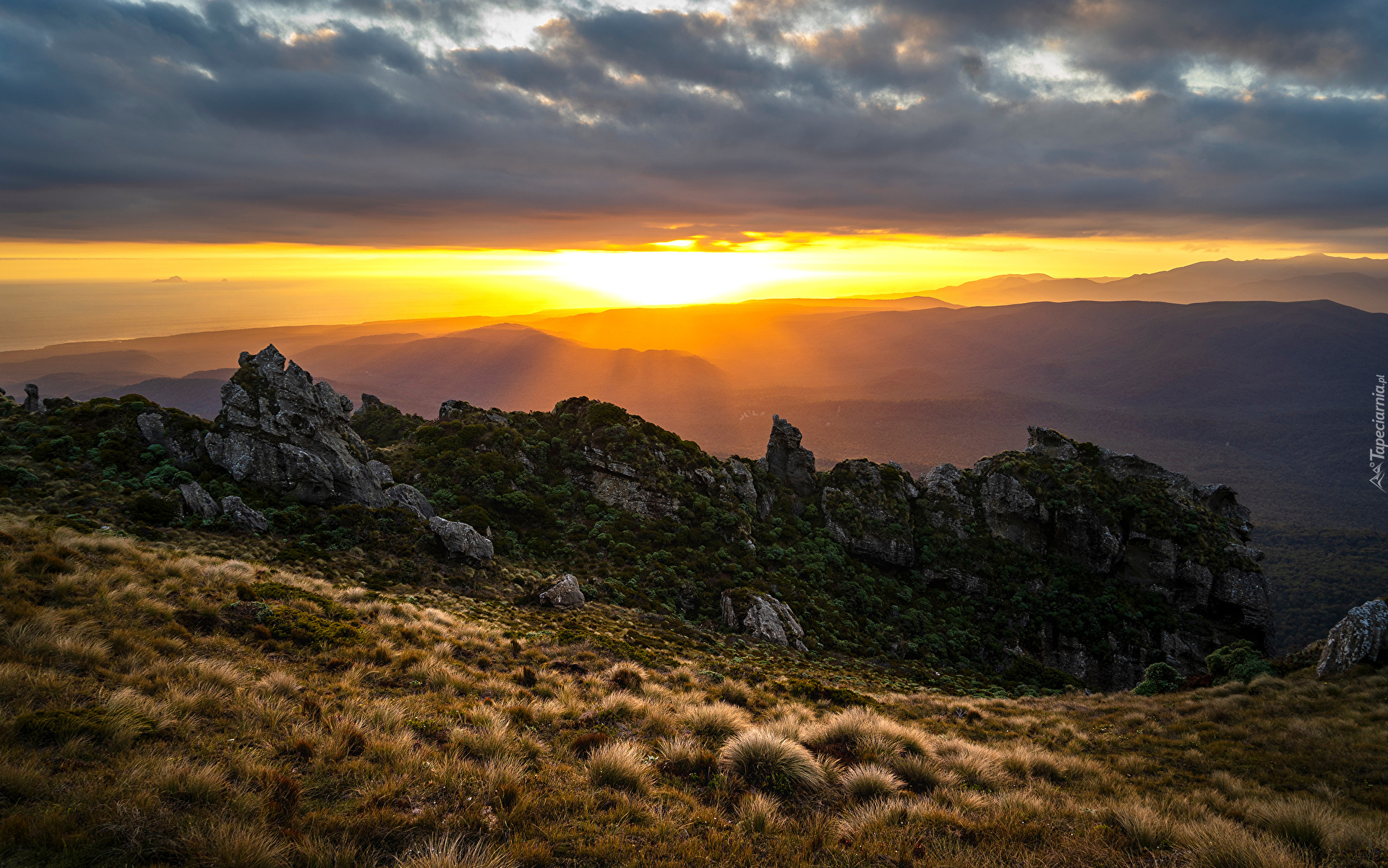 Edytor tapety: Słoneczny blask zza ciemnych chmur nad górami
