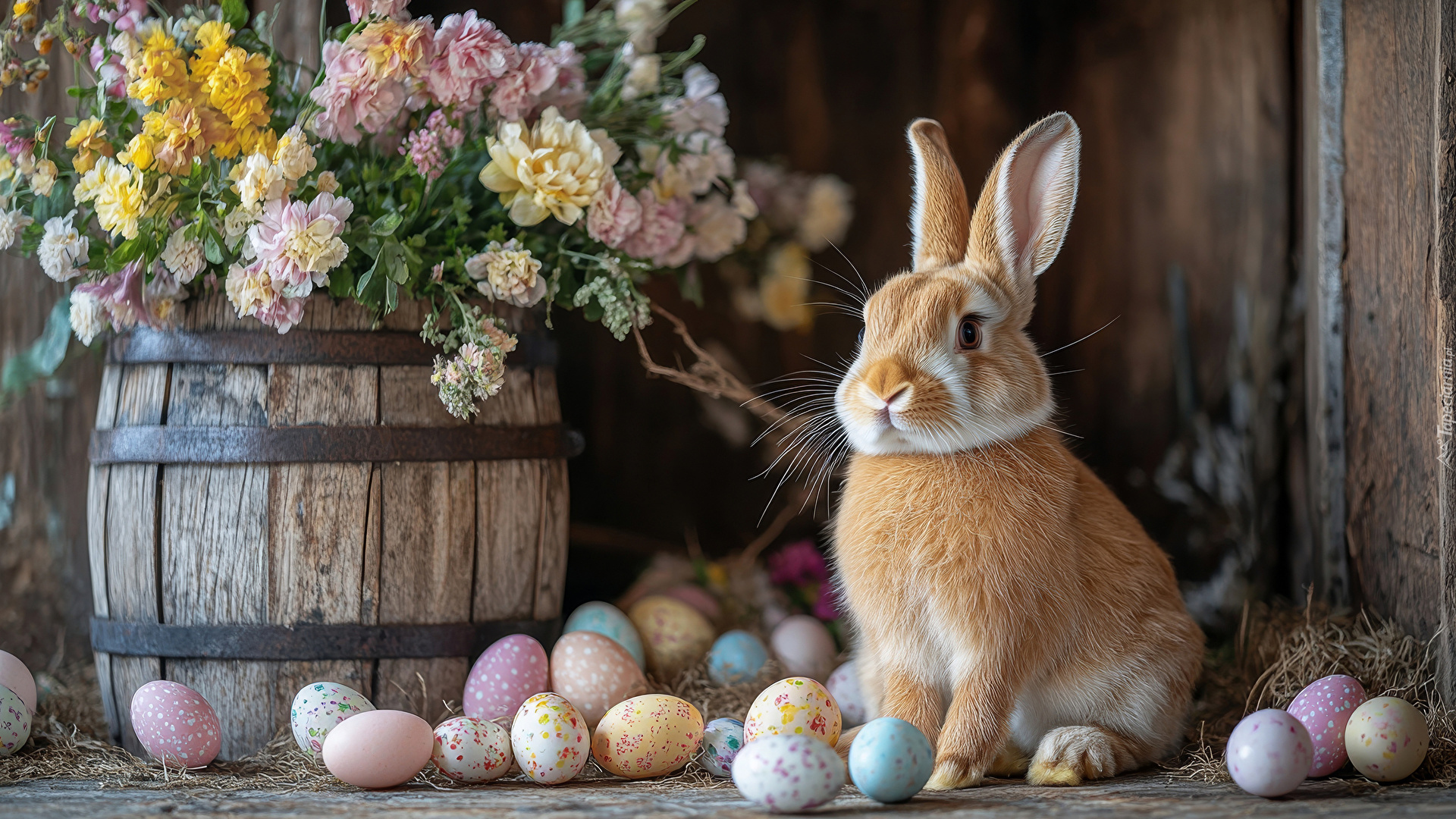 Edytor tapety: Królik i pisanki obok kwiatów na beczce