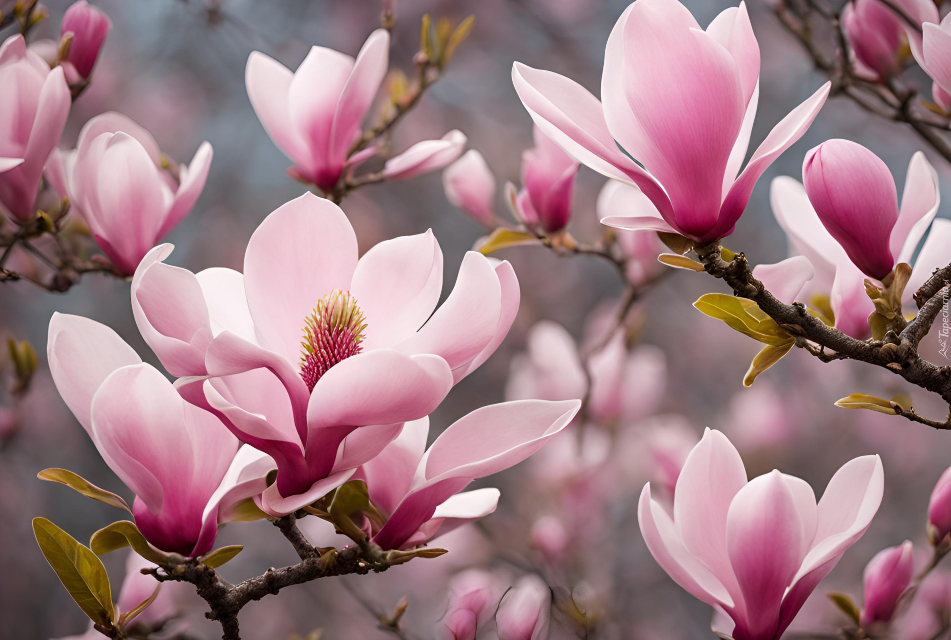 Edytor tapety: Jasnoróżowe kwiaty magnolii na gałązkach