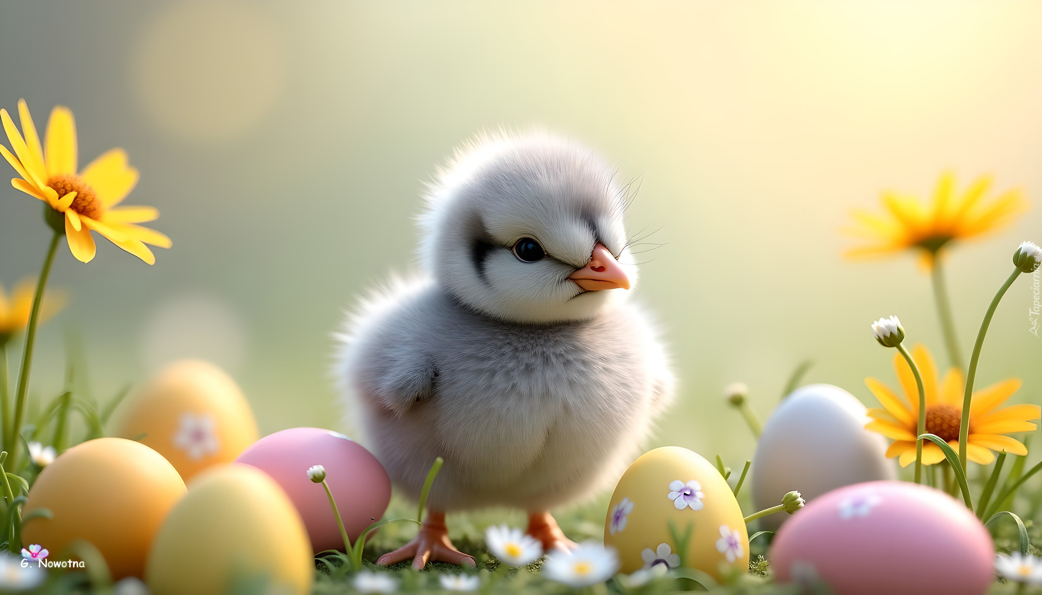 Edytor tapety: Szary kurczaczek obok kolorowych pisanek i żółtych kwiatów