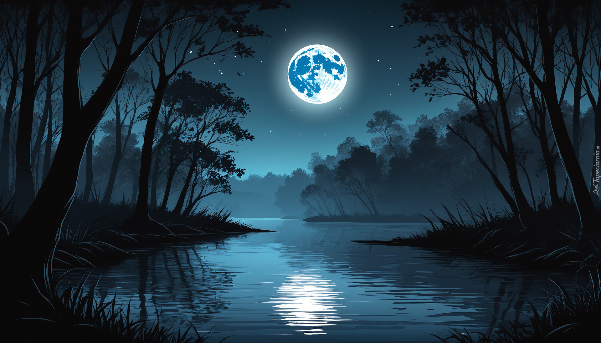 Edytor tapety: Drzewa nad rzeką nocną porą w blasku księżyca