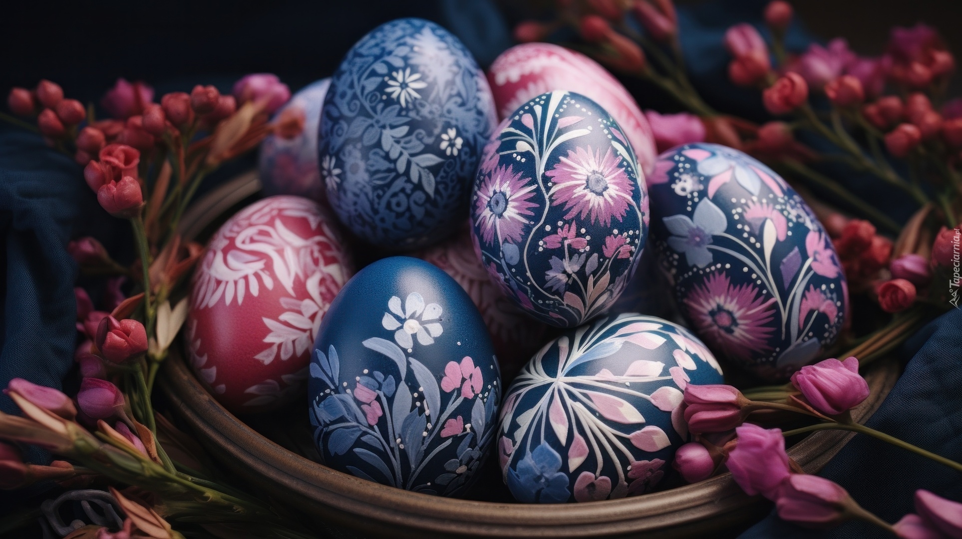 Edytor tapety: Malowane pisanki w koszyku obok kwiatów