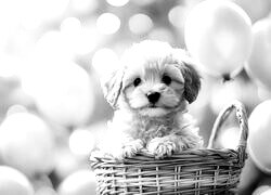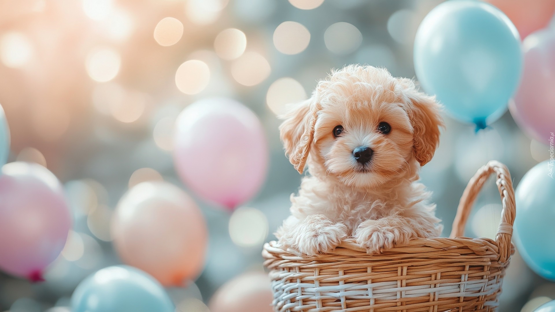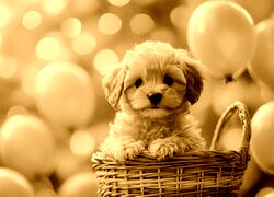 Edytor tapety: Jasnobrązowy szczeniak w koszyku i balony w tle