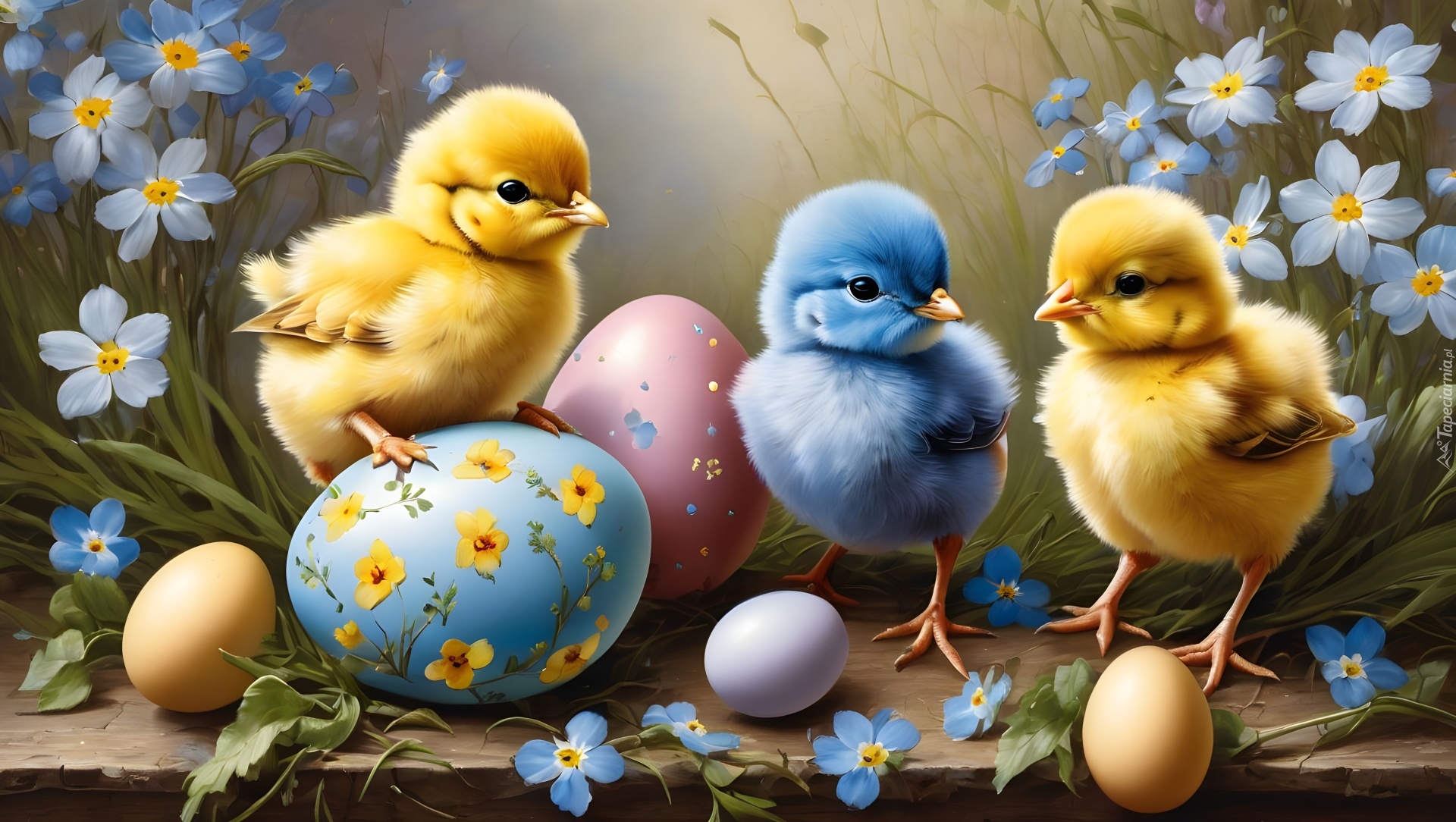 Edytor tapety: Trzy kurczaczki obok kolorowych pisanek i niebieskich kwiatów