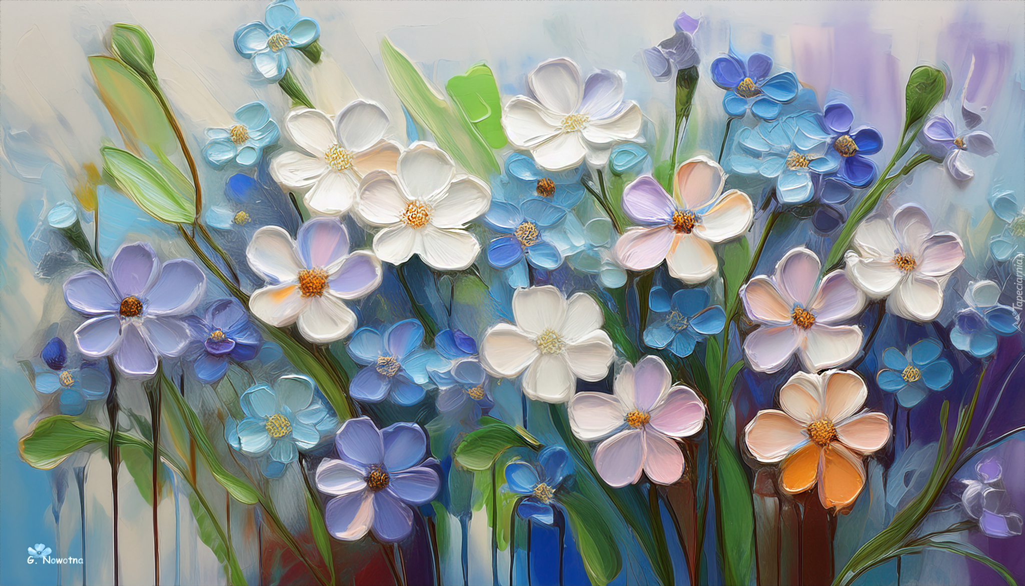 Edytor tapety: Grafika z niebieskimi i białymi kwiatami