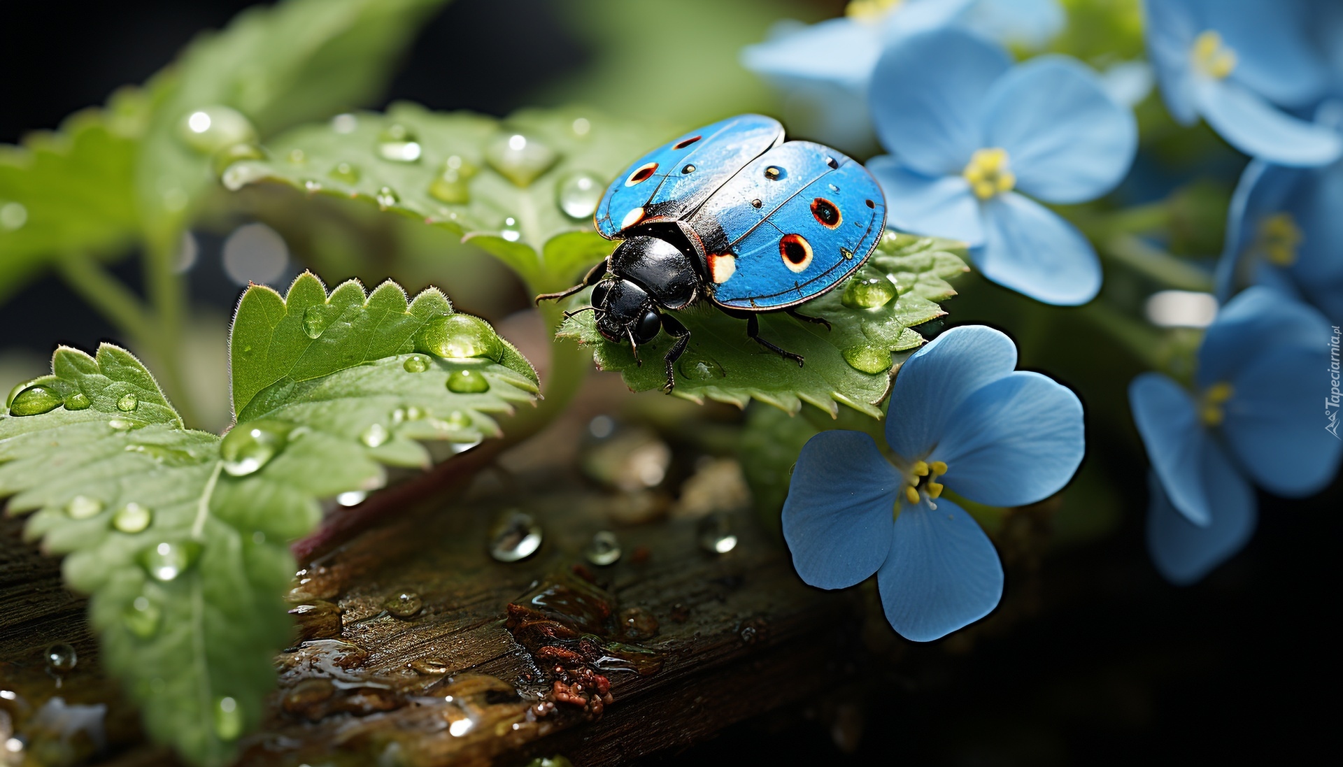 Edytor tapety: Niebieski owad na mokrych liściach obok niebieskich kwiatów