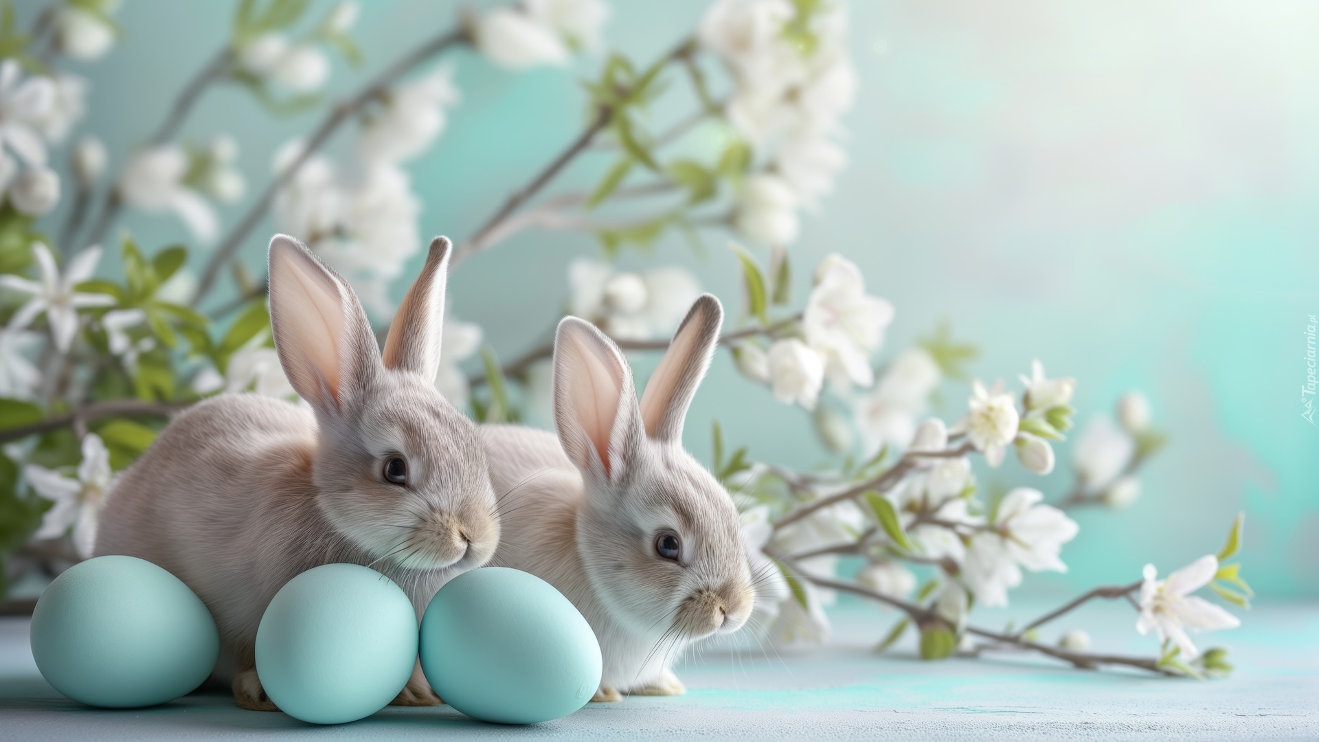 Edytor tapety: Dwa króliki i trzy pisanki obok ukwieconych gałązek