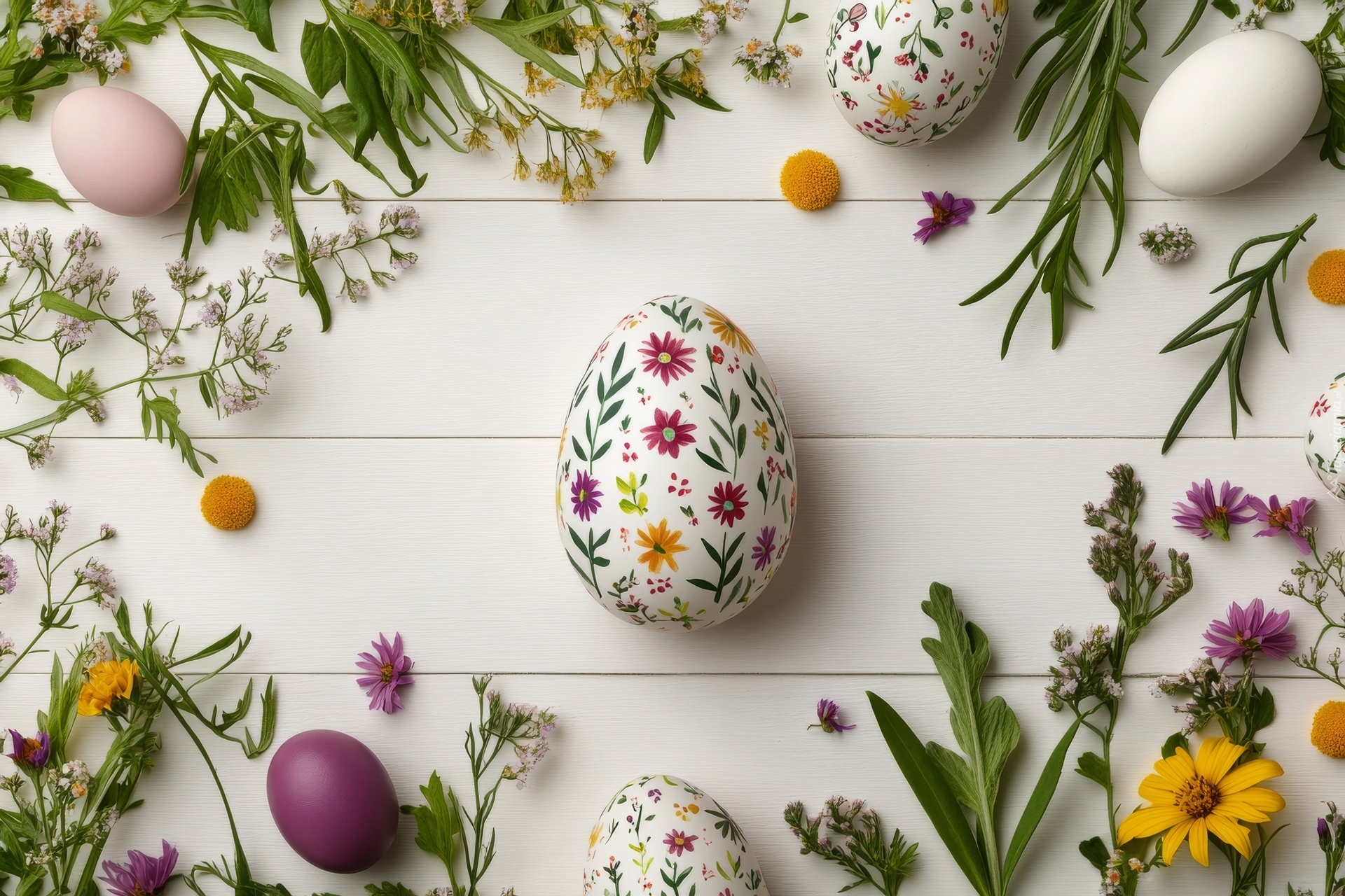 Edytor tapety: Kolorowe pisanki i kwiaty na białych deskach