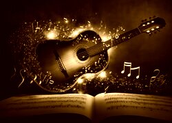 Edytor tapety: Gitara i nuty w blasku światła w grafice