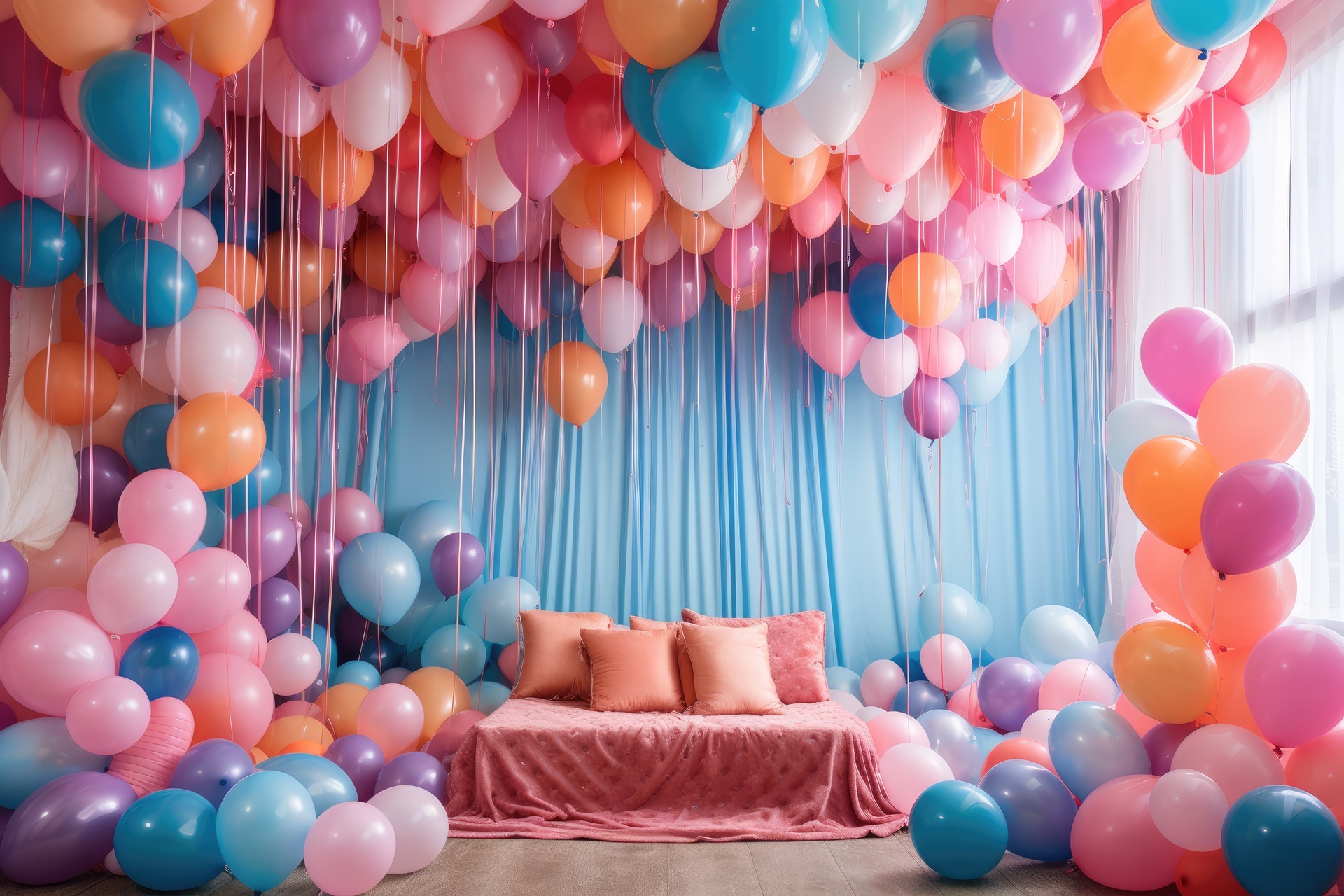 Edytor tapety: Wnętrze sypialni udekorowane kolorowymi balonikami