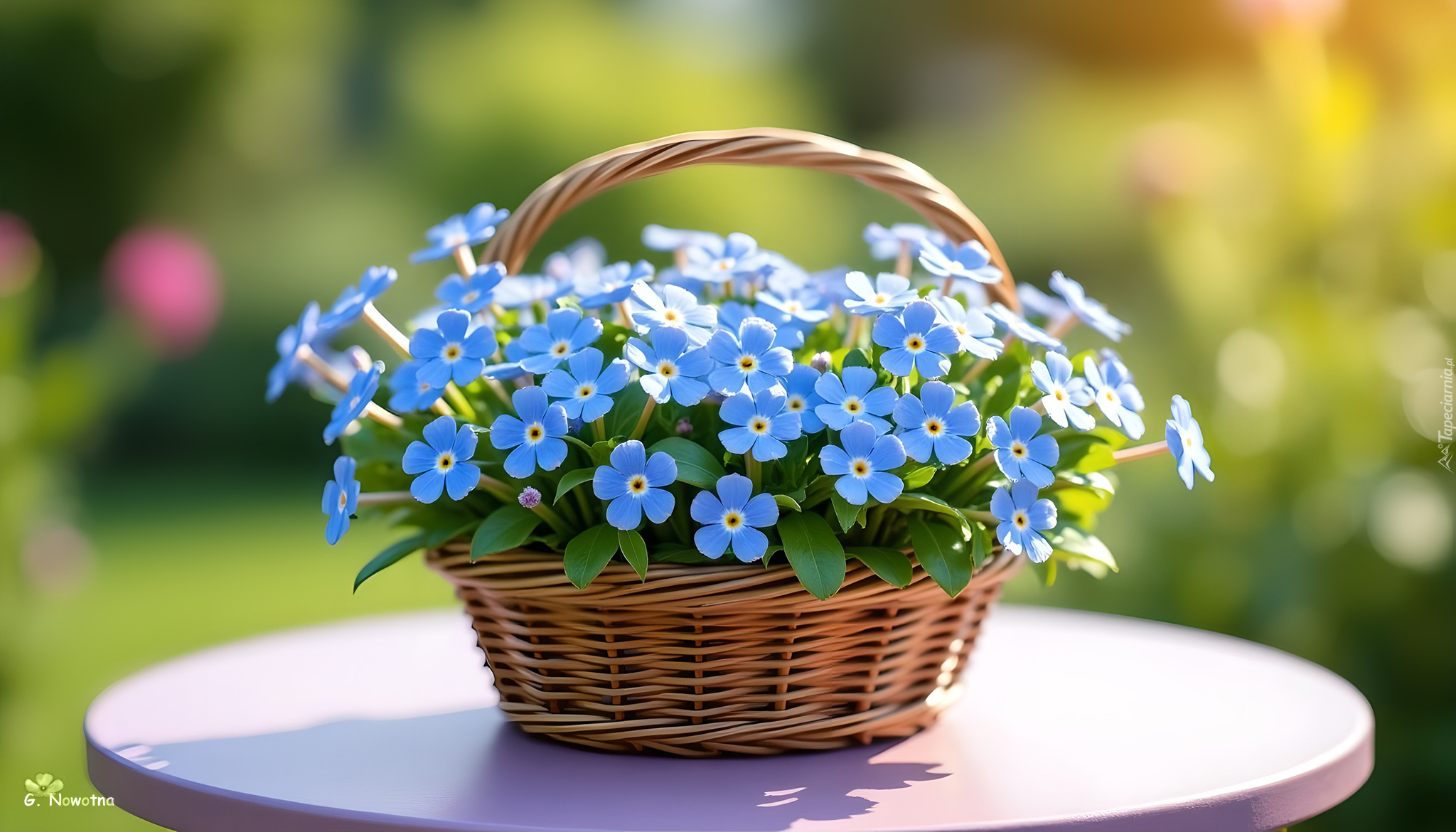 Edytor tapety: Niebieskie kwiaty w wiklinowym koszyku na stoliku