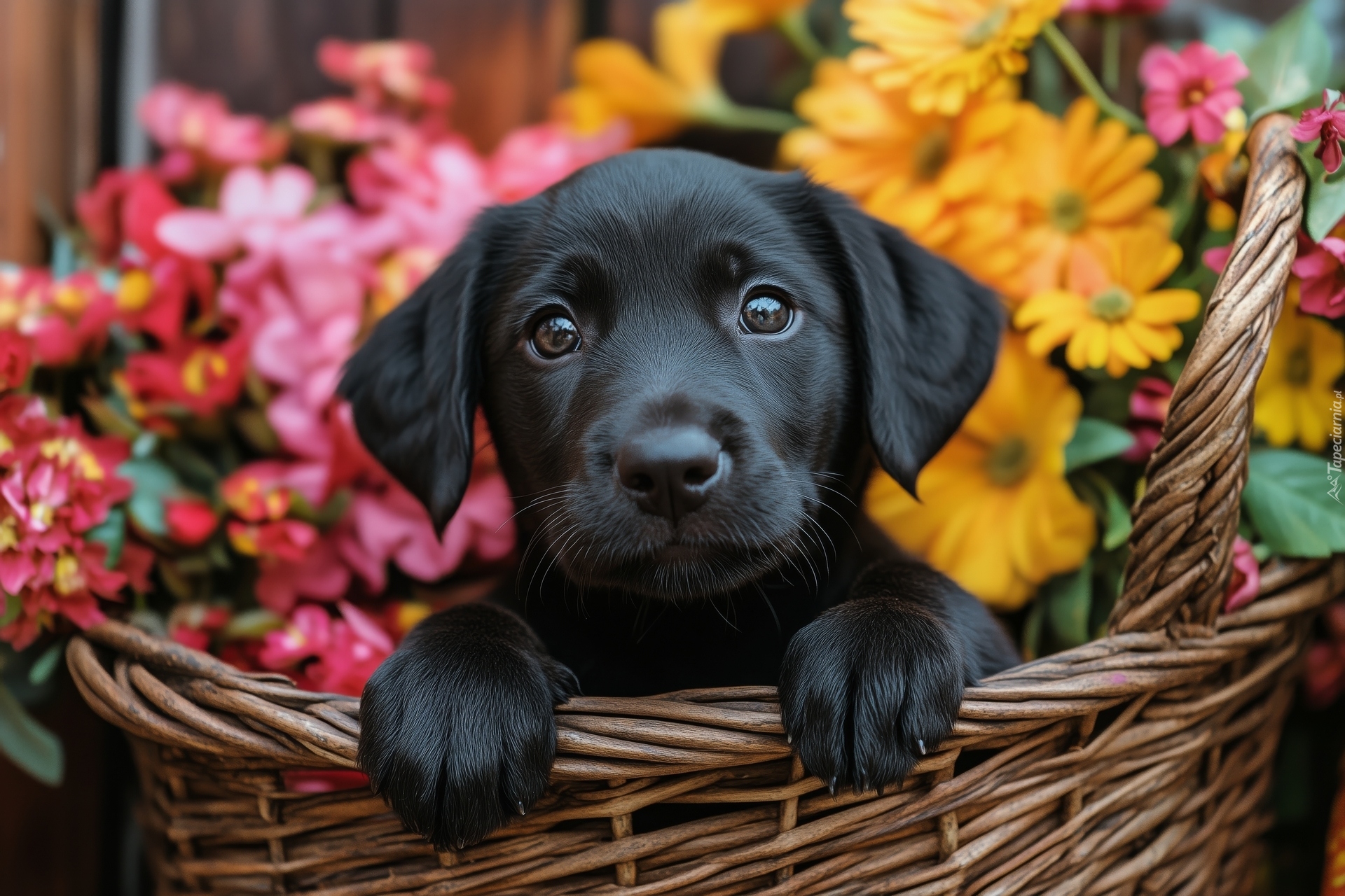 Edytor tapety: Koszyk z czarnym szczeniakiem obok kwiatów