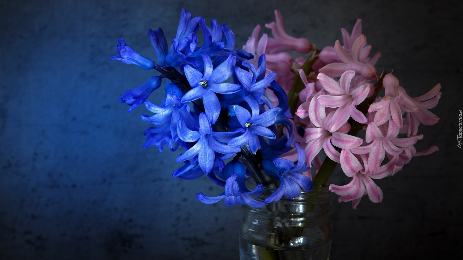 Edytor tapety: Różowy i niebieski hiacynt w słoiku