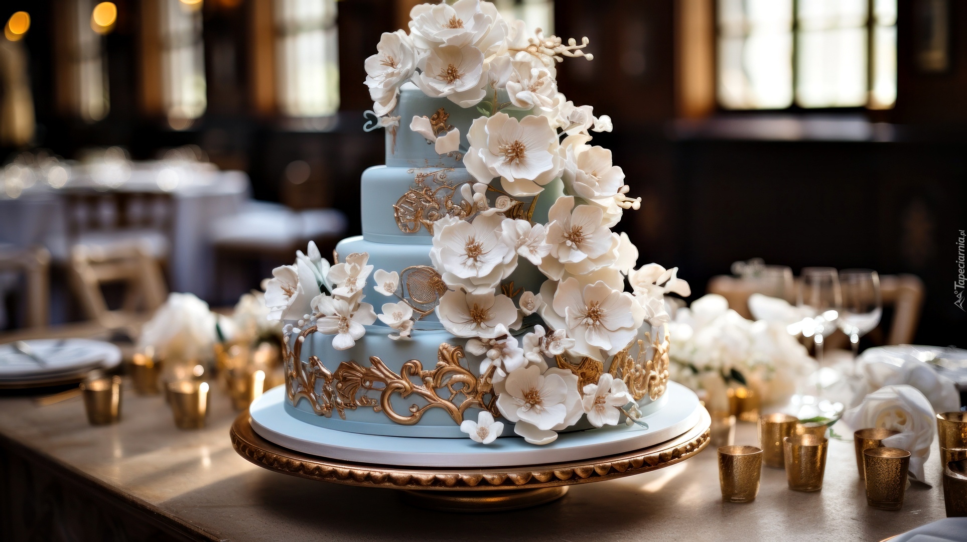 Edytor tapety: Tort weselny ozdobiony białymi kwiatami