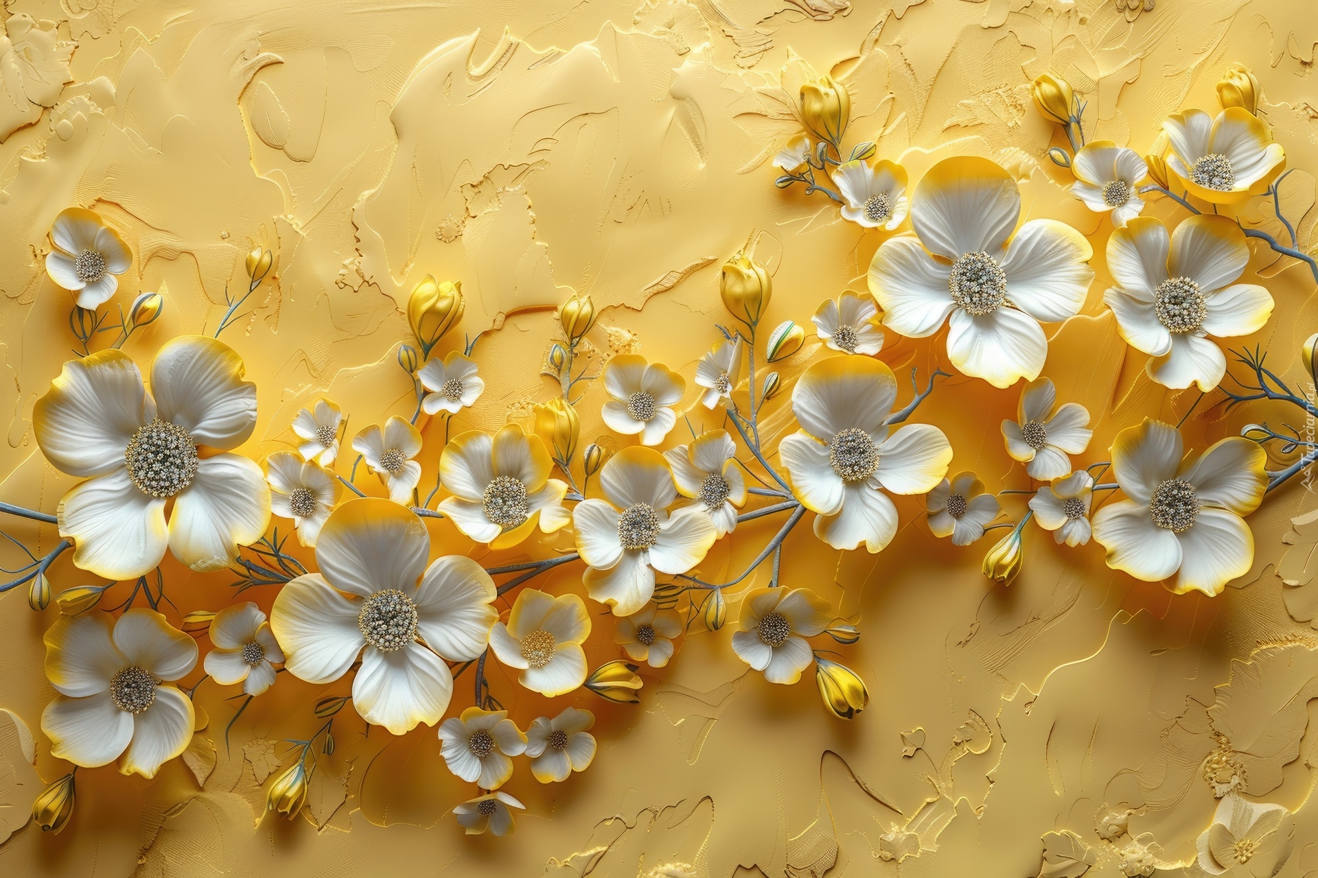 Edytor tapety: Gałązki z białymi kwiatkami na żółtym tle