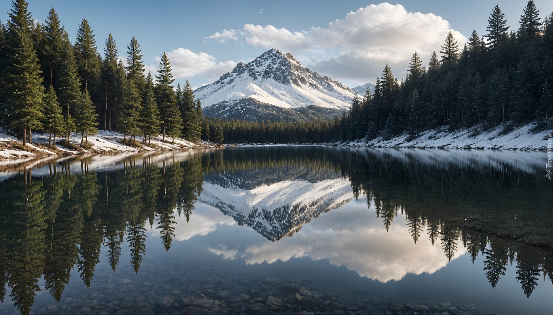 Edytor tapety: Odbicie lasu iglastego i ośnieżonych gór w jeziorze