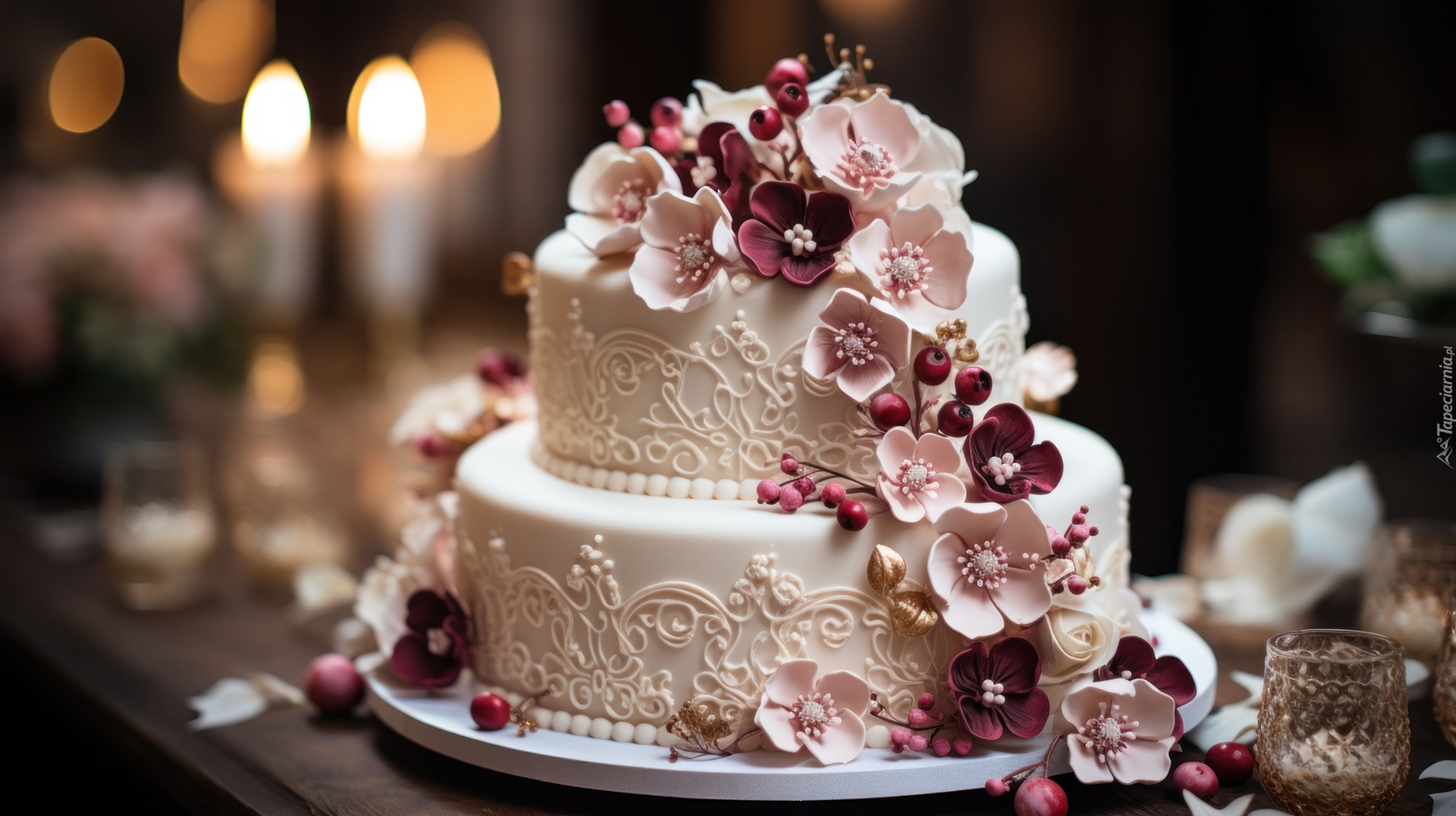 Edytor tapety: Biały tort weselny ozdobiony lukrowymi kwiatami