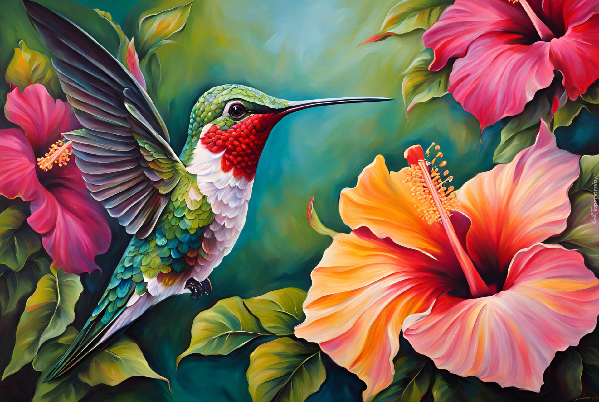 Edytor tapety: Koliber obok kwiatów hibiskusa w grafice