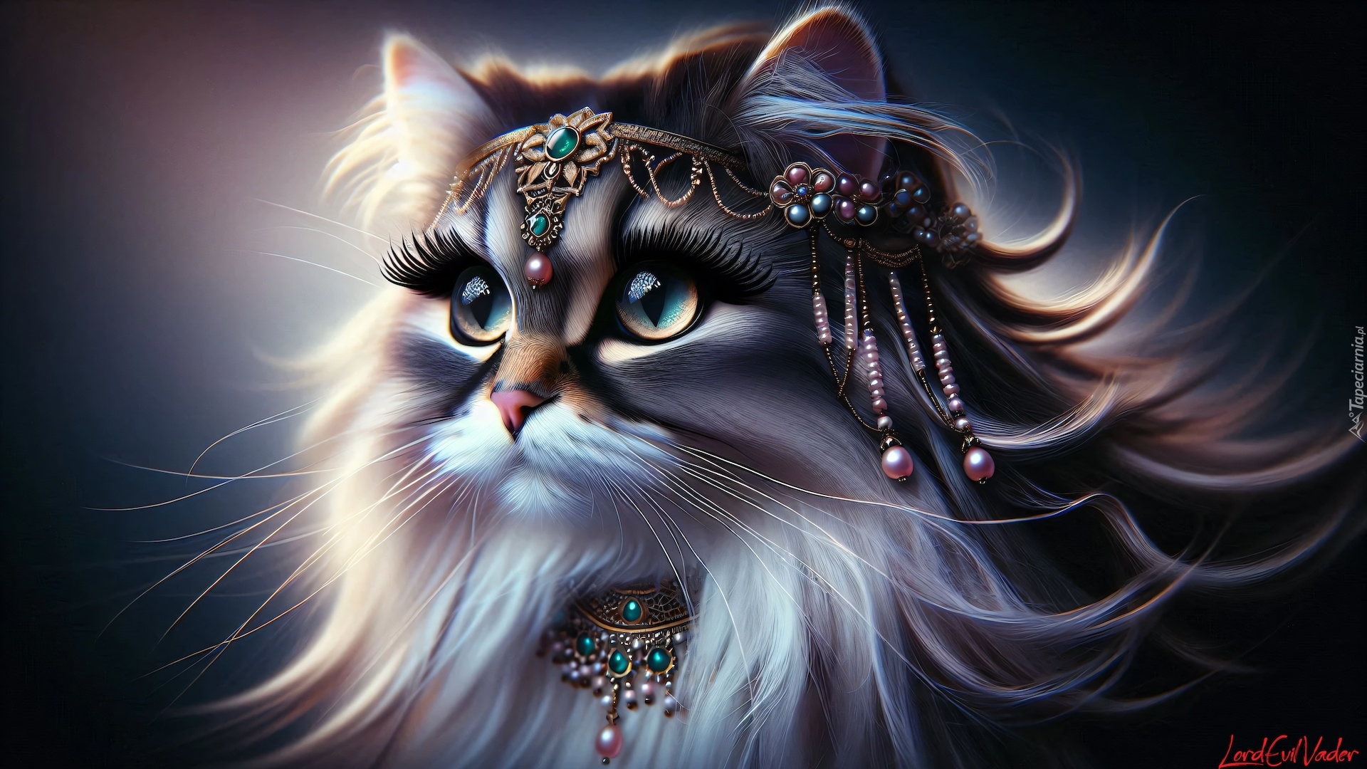Edytor tapety: Długowłosy kot z biżuterią w grafice
