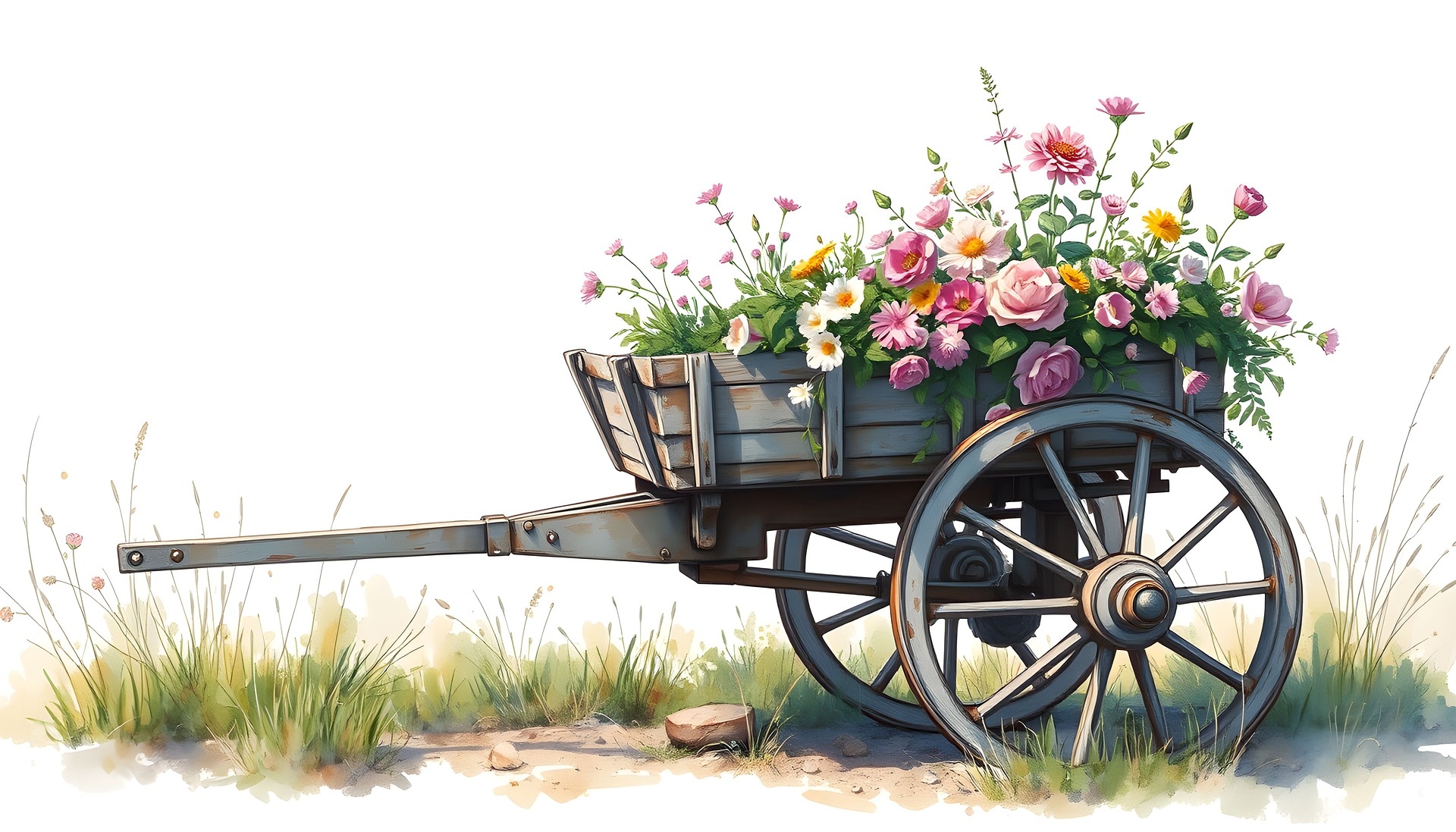 Edytor tapety: Dwukołowy wózek z kolorowymi kwiatami w grafice