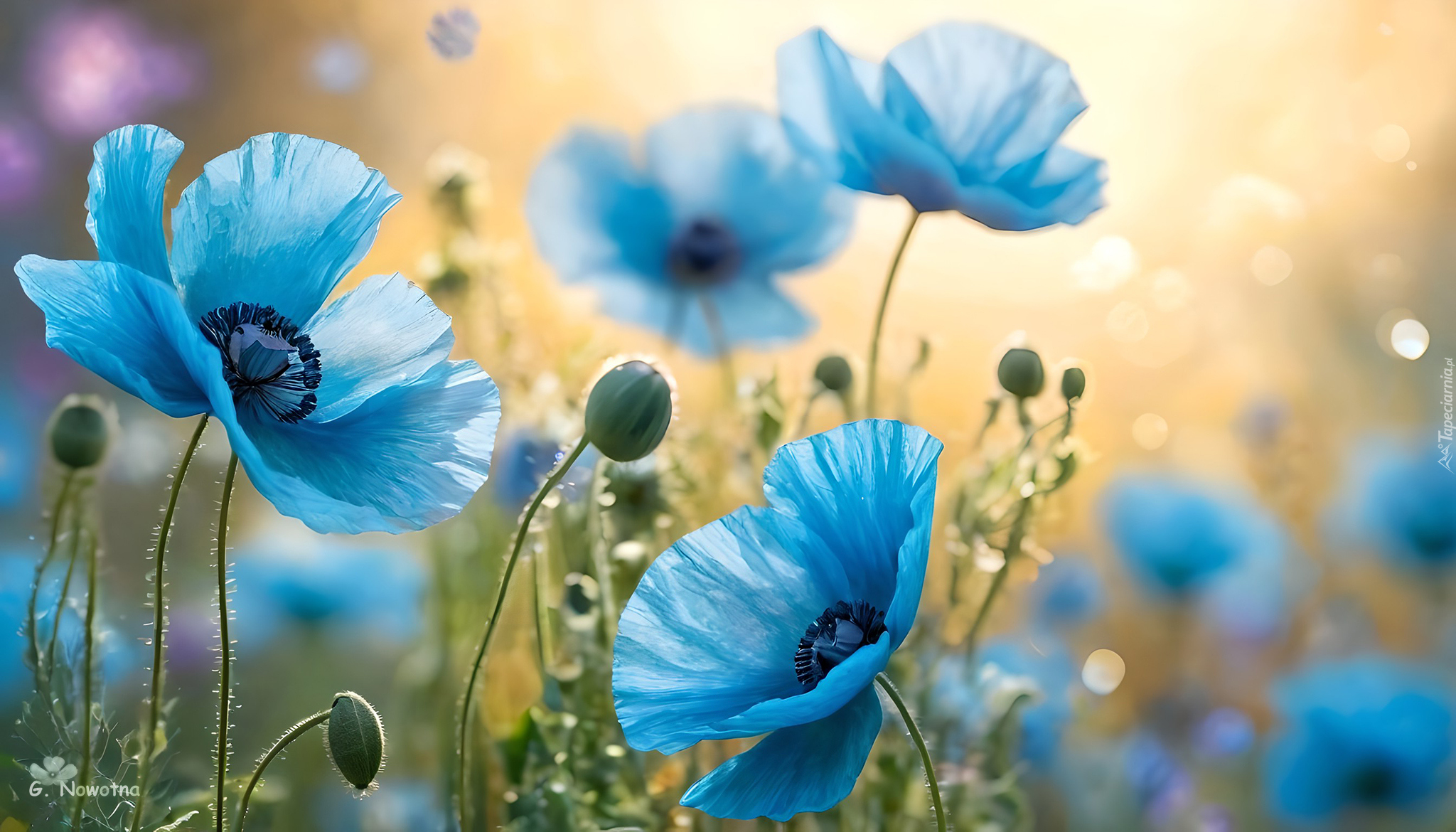 Edytor tapety: Niebieskie maki z pąkami w słonecznym blasku