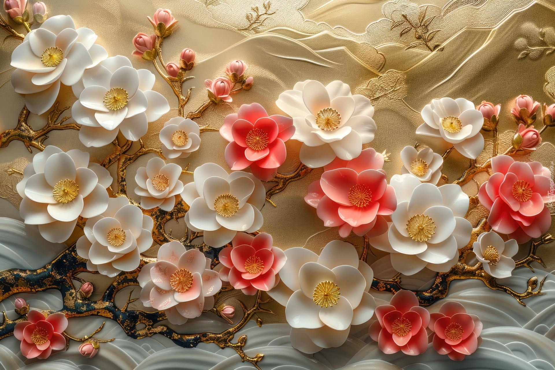 Edytor tapety: Gałązki z białymi i różowymi kwiatami w grafice