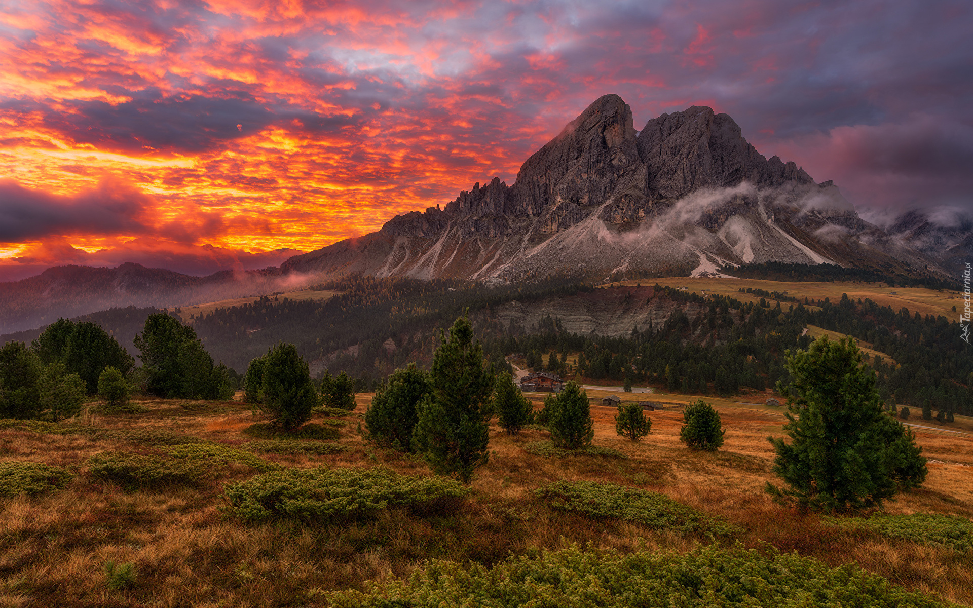 Edytor tapety: Kolorowe chmury zachodzącego słońca nad Dolomitami