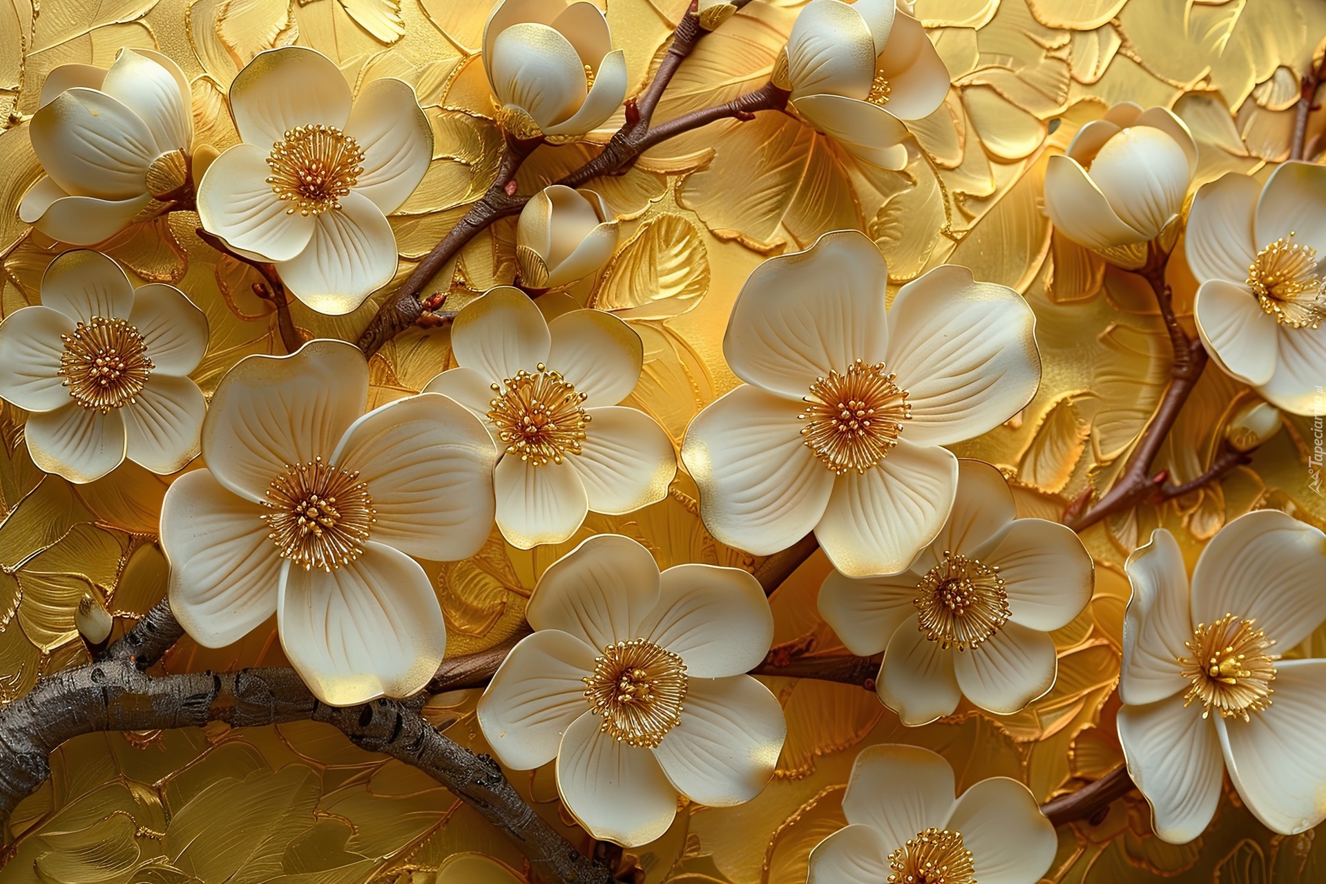 Edytor tapety: Gałązki z biało-złotymi kwiatami na żółtym tle