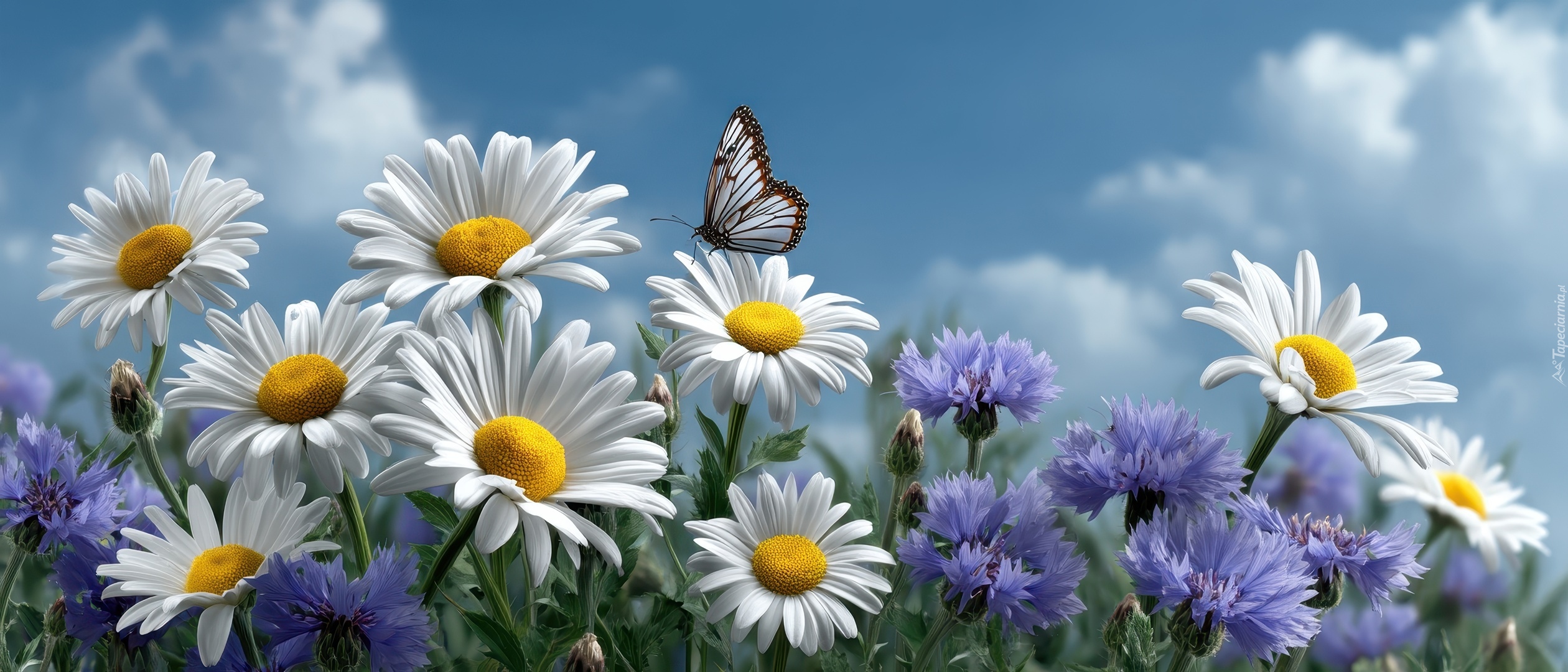 Edytor tapety: Motyl nad rumiankami i chabrami w grafice