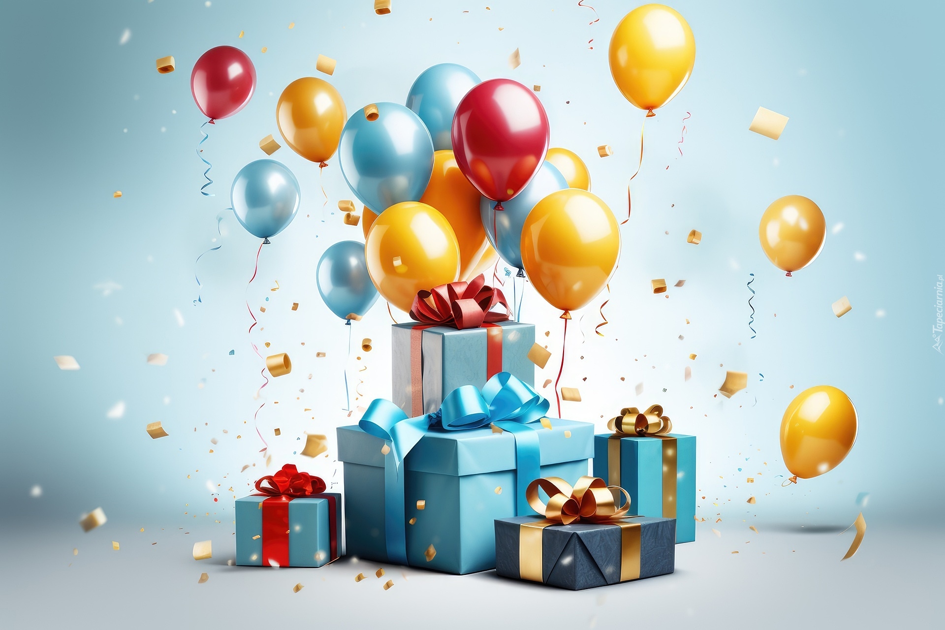 Edytor tapety: Prezenty z kokardami i kolorowe baloniki