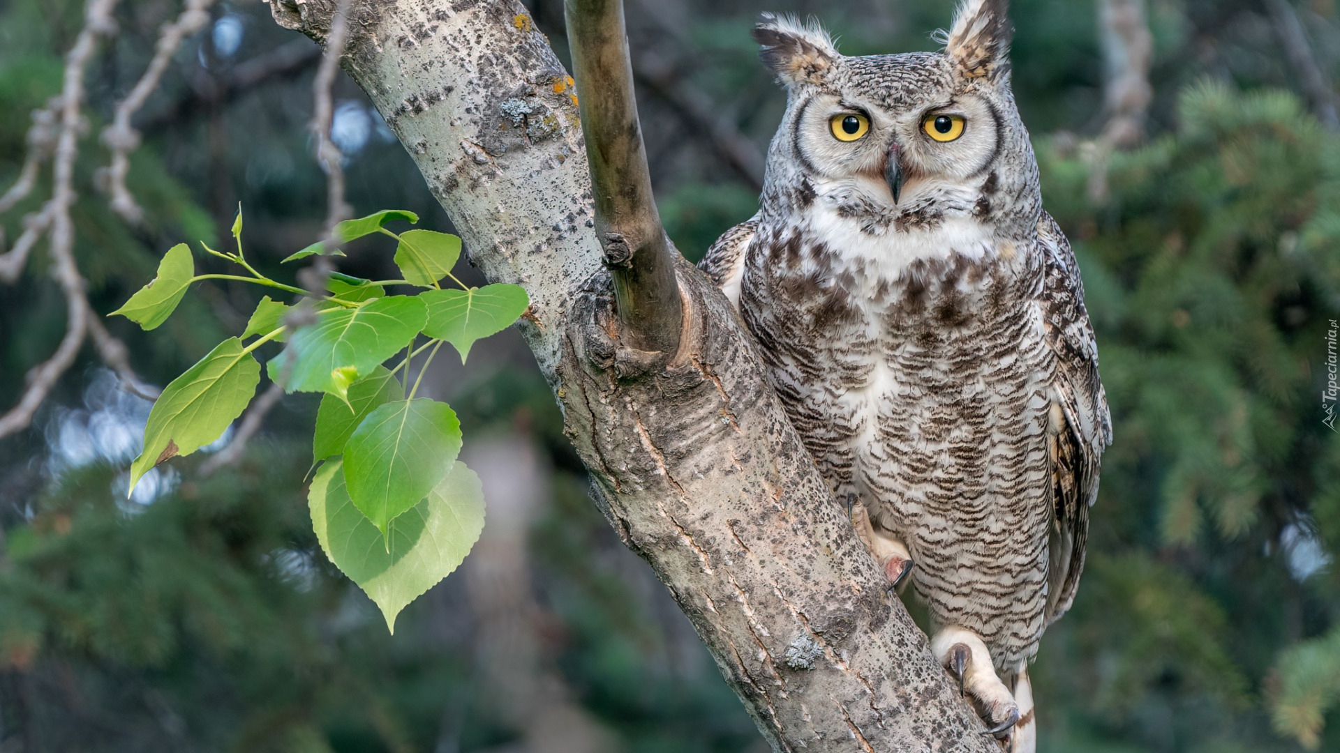 Edytor tapety: Puchacz i liście na konarze drzewa