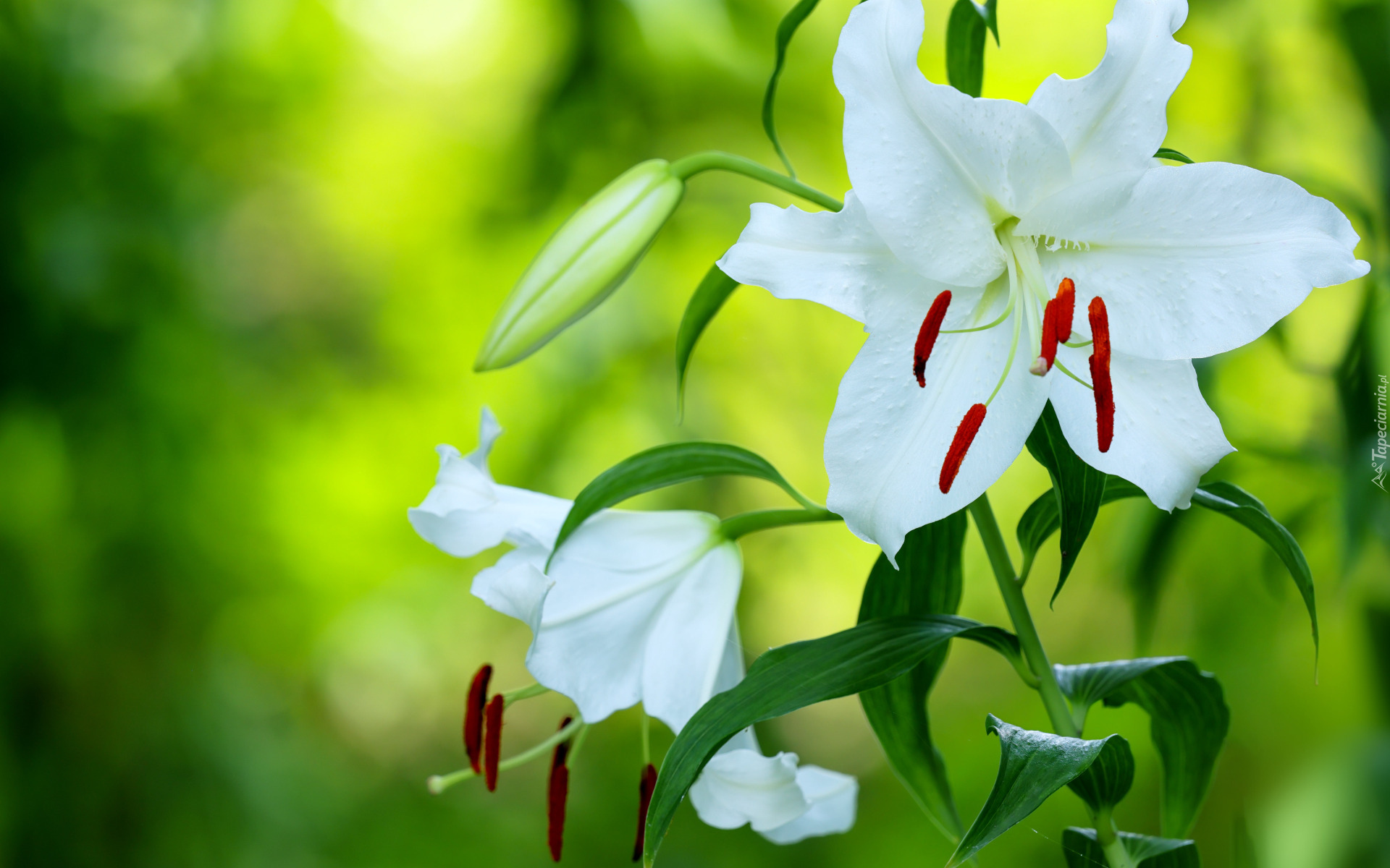 Edytor tapety: Białe lilie z liśćmi na rozświetlonym zielonym tle