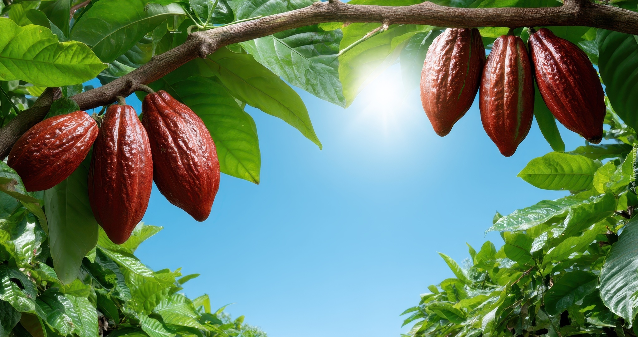 Edytor tapety: Rozświetlone słońcem owoce kakaowca i liście na gałęzi