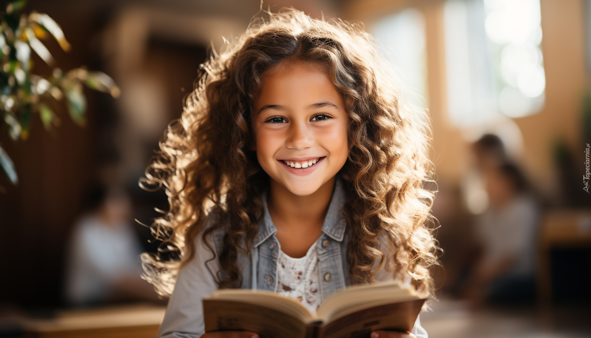 Edytor tapety: Uśmiechnięta długowłosa dziewczynka z kręconymi włosami z książką