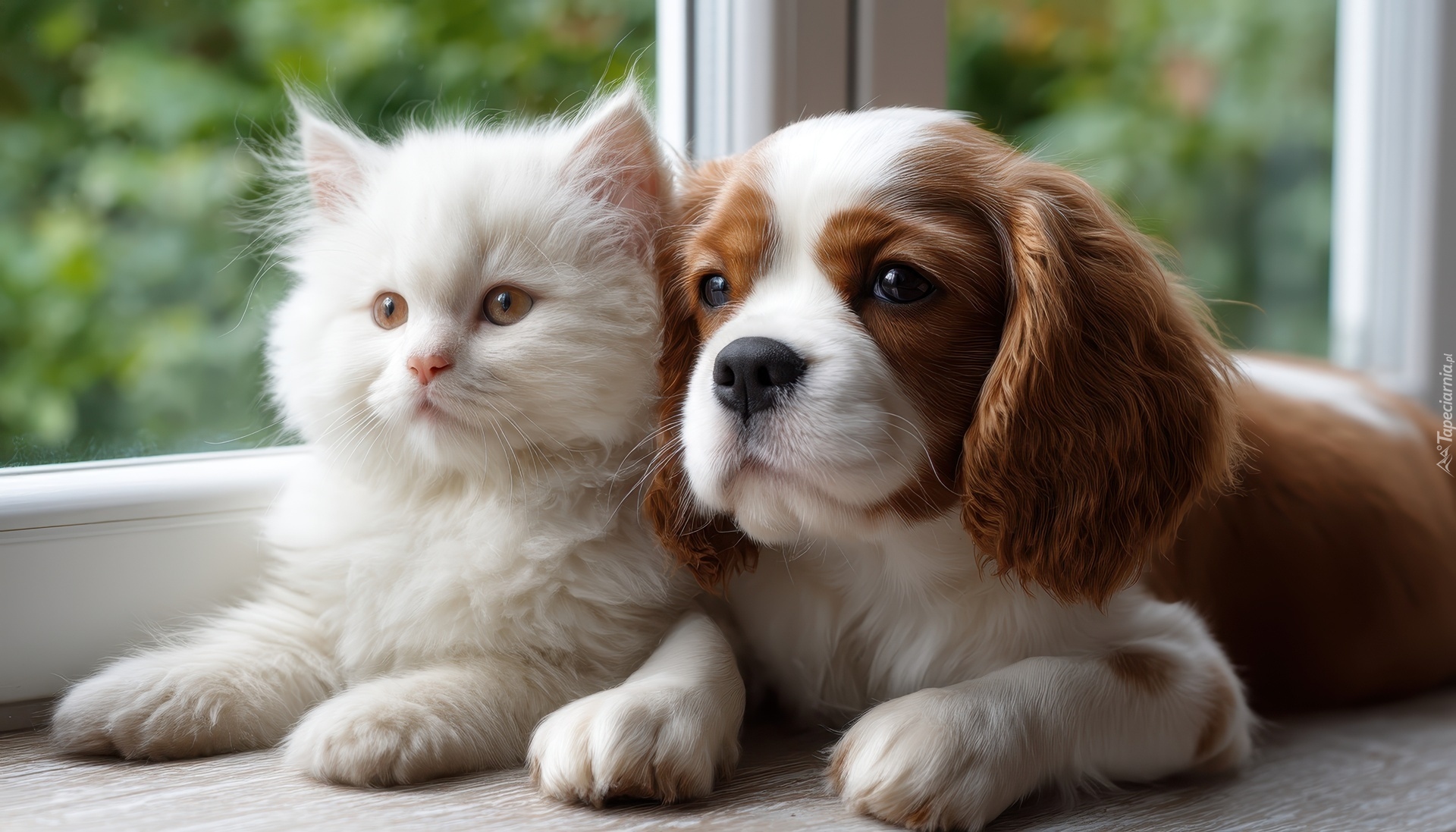 Edytor tapety: Biały kot i brązowo-biały szczeniak przy oknie