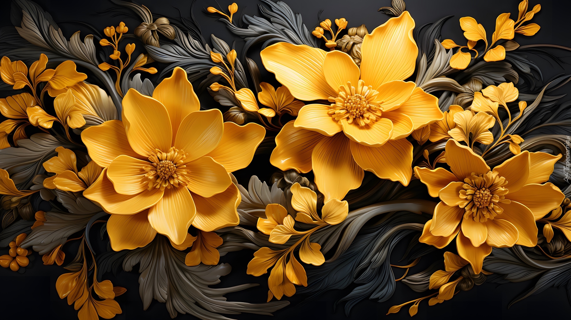 Edytor tapety: Żółte kwiaty z listkami w grafice