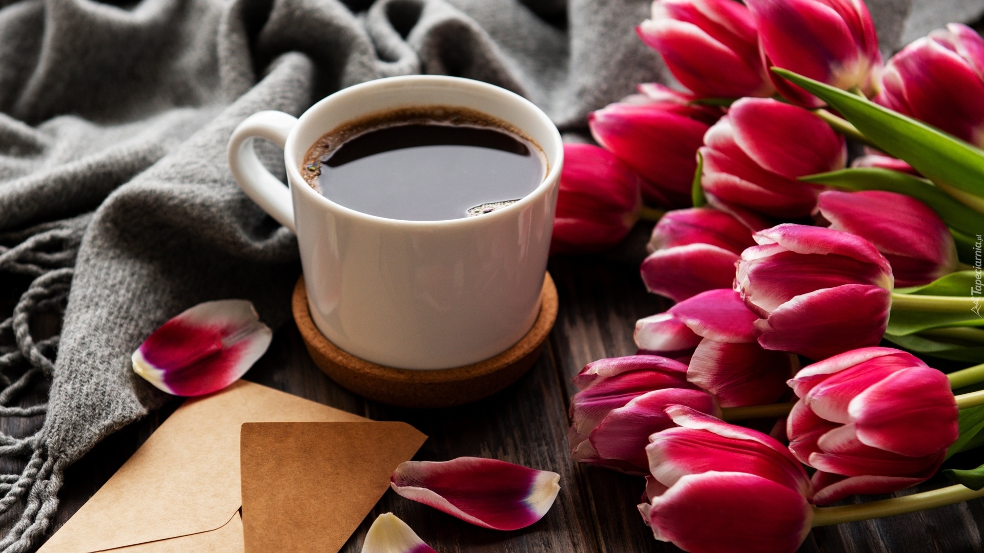 Edytor tapety: Filiżanka z kawą obok koperty i bukietu tulipanów