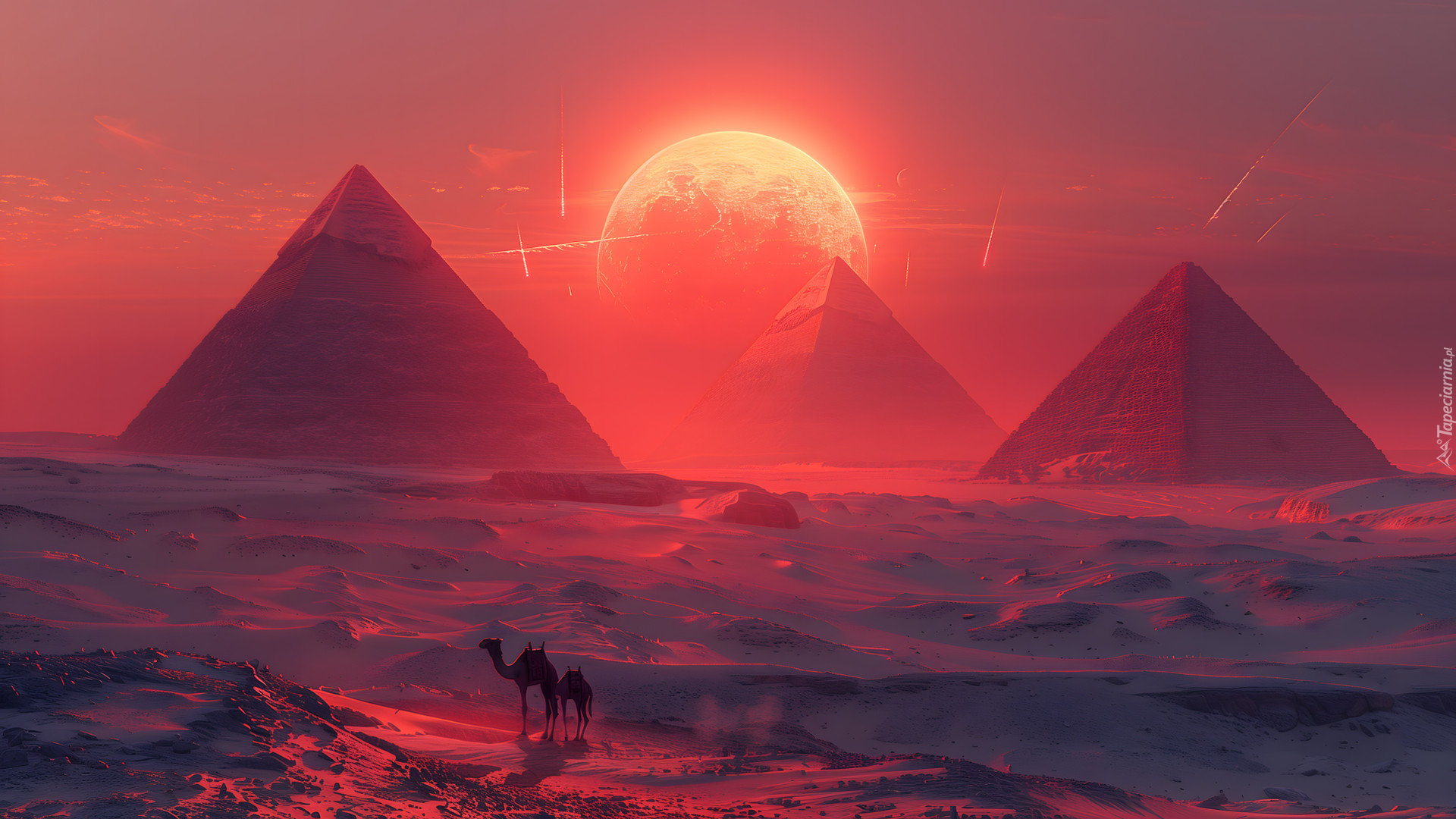 Edytor tapety: Wielbłądy na pustyni i zachód słońca nad piramidami