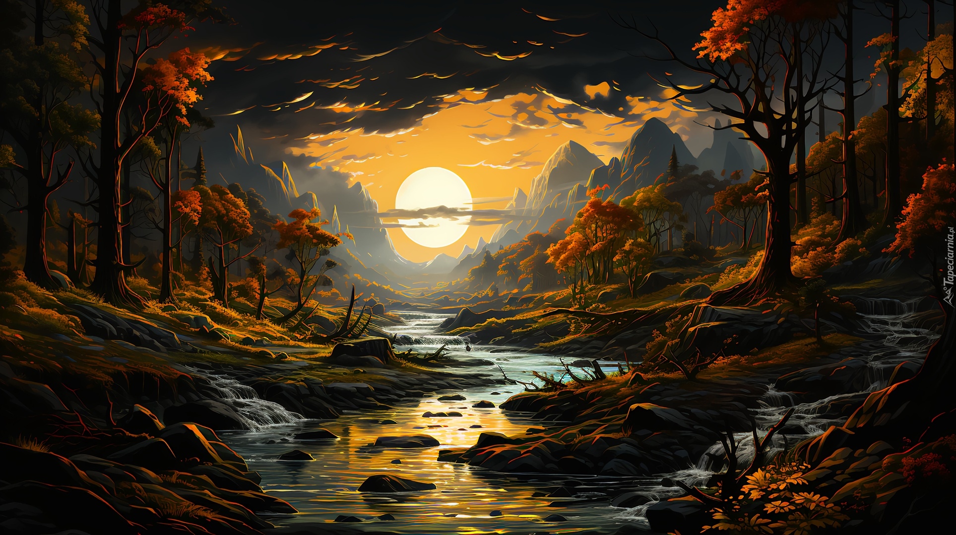 Edytor tapety: Pożółkłe drzewa nad górską rzeką o zachodzie słońca