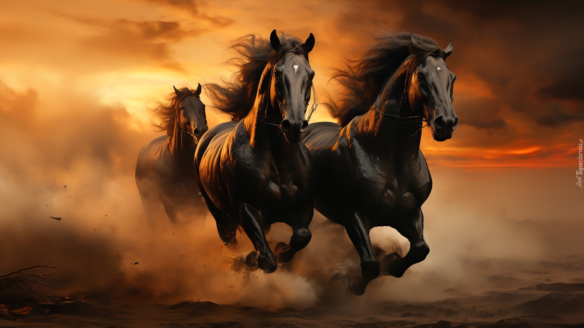 Edytor tapety: Trzy konie galopujące po piasku o zachodzie słońca