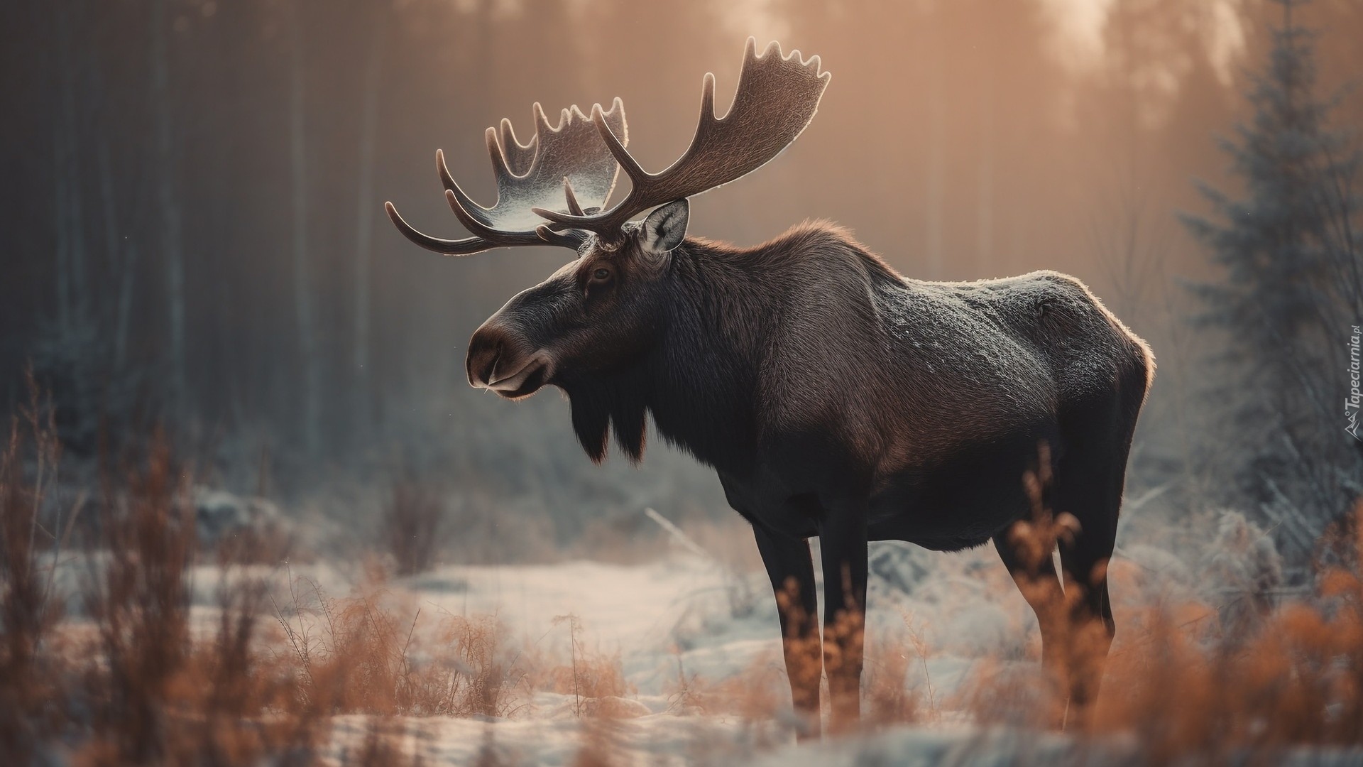 Edytor tapety: Łoś stojący w śniegu obok suchych roślin