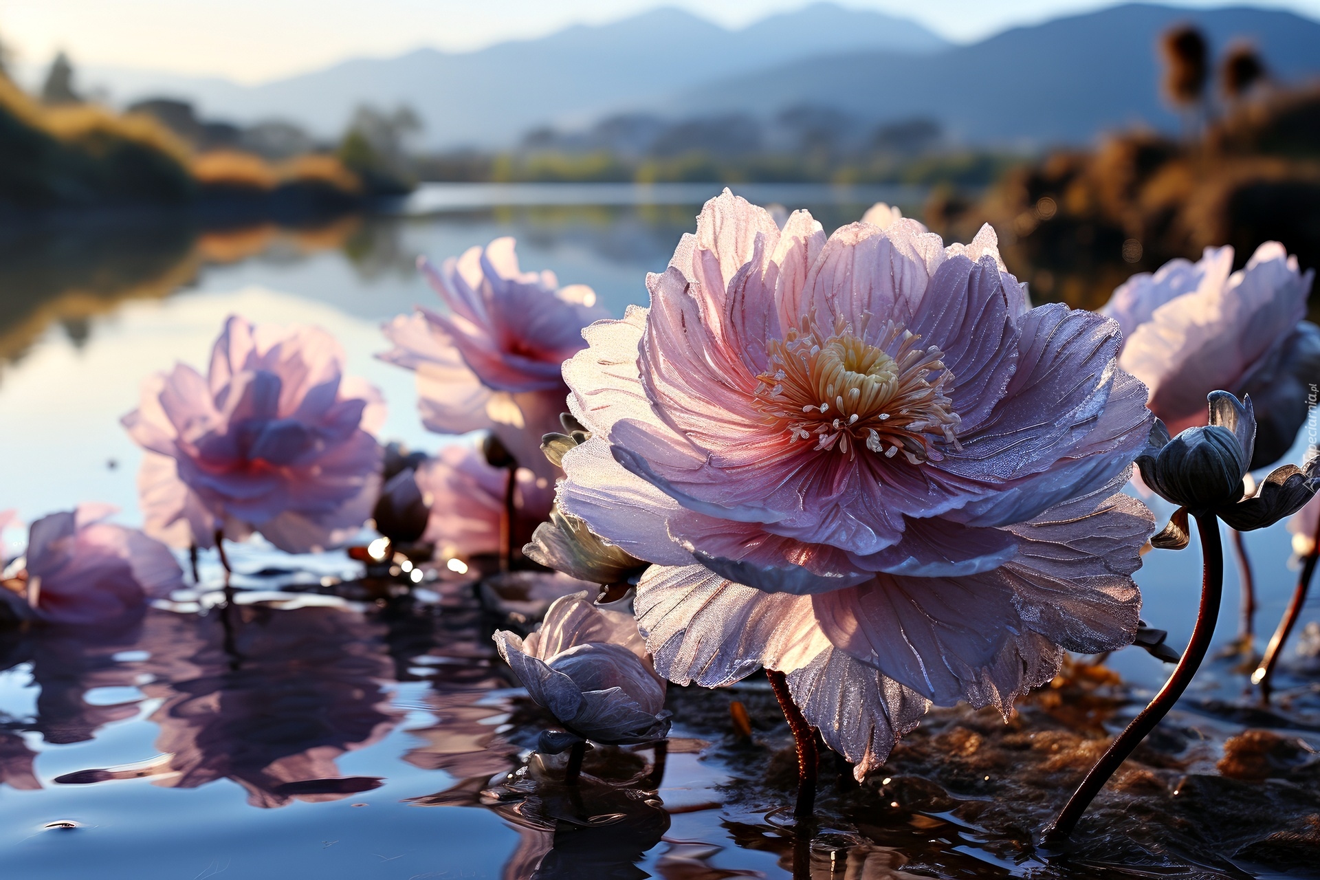 Edytor tapety: Rozkwitnięte różowe kwiaty w wodzie