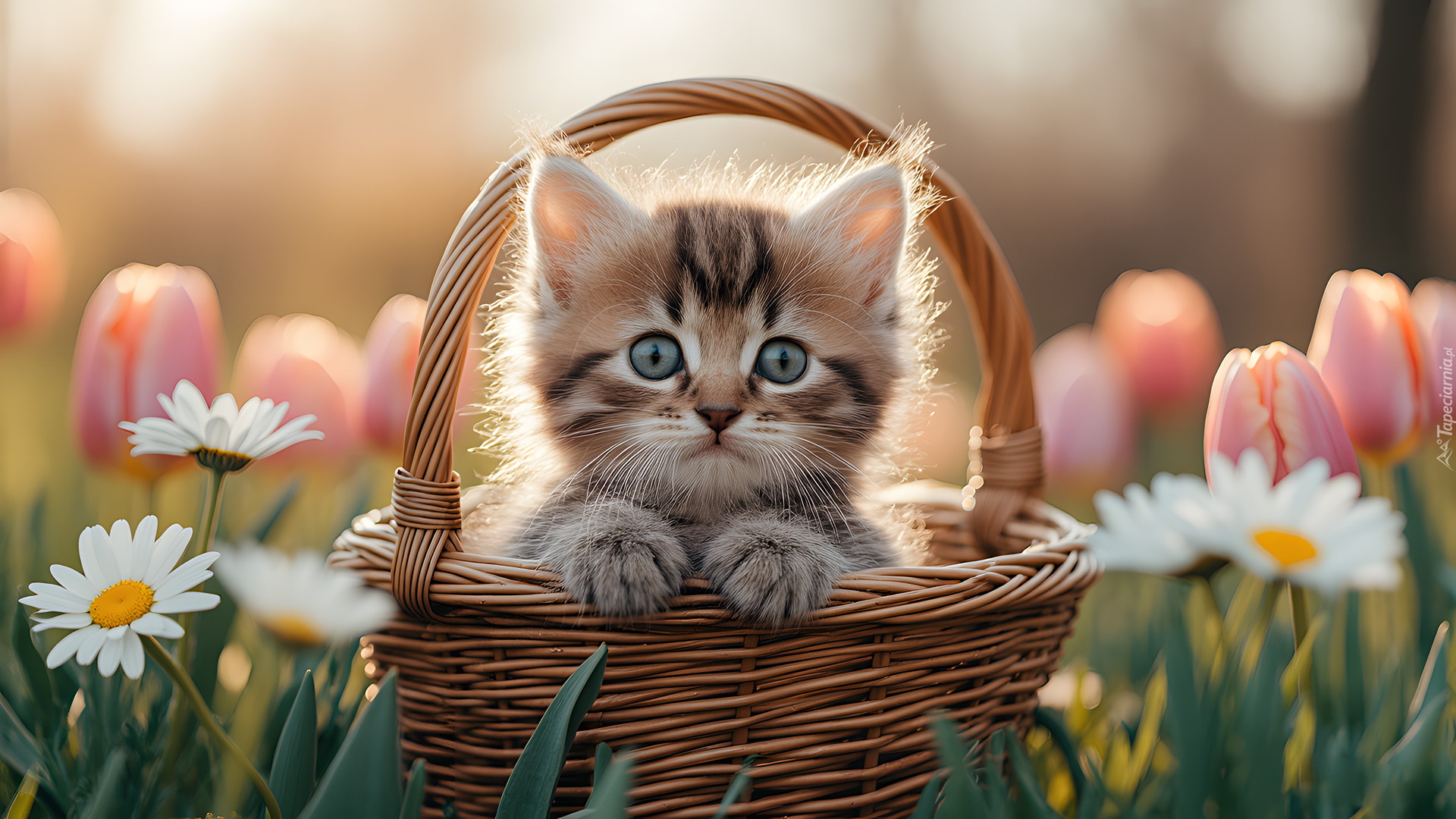 Edytor tapety: Mały kotek w koszyku wśród kolorowych kwiatów